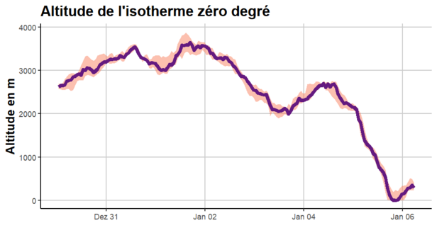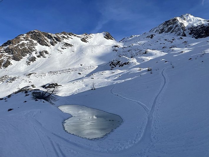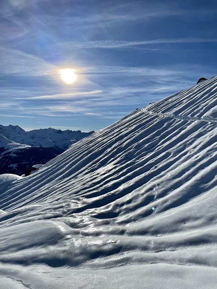 Les fortes pluies suivies d’un temps ensoleillé et sec ont eu un effet positif sur l‘évolution du danger d’avalanches. Pendant les longues nuits claires, la surface neigeuse pouvait bien geler et se consolider malgré les températures douces. Le danger d’avalanches est passé du degré 4 (fort) de la dernière période couverte par le rapport hebdomadaire à nouveau aux degrés faible et limité le mardi 4 janvier. Même le vent fort de secteur ouest, qui soufflait surtout le lundi 3 et le mardi 4 janvier, n’a pratiquement rien pu y changer. Il a tout au plus encore déplacé un peu de neige à très haute altitude, mais il n’est pas parvenu à détruire la croûte dure.