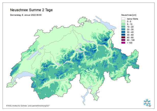 Le mercredi et le jeudi, l’hiver s’est à nouveau manifesté par une incursion marquée d’air froid. Dans la partie la plus occidentale du Bas-Valais, sur le versant nord des Alpes et dans le nord des Grisons, il est tombé de 20 à 40 cm de neige, et ailleurs de 10 à 20 cm. Dans l’extrême sud, il n’y a eu que peu de neige fraîche (cf. figure 6). Dans le nord, le danger d’avalanches a augmenté jusqu’au degré marqué en raison de la neige fraîche, tandis que dans le nord et le centre des Grisons, la neige soufflée combinée à la neige ancienne fragile constituait l’élément déterminant justifiant également un danger marqué d’avalanches.