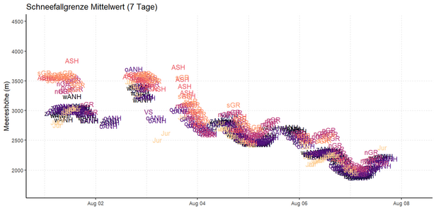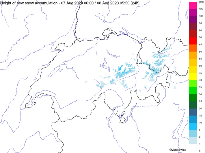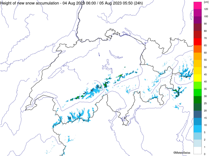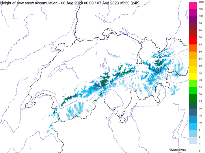 Alors que le temps des semaines précédentes offrait déjà un mélange variable de soleil et de pluie en montagne, de la neige fraîche s'est annoncée en montagne à partir du vendredi 4 août. Avec un vent souvent fort de nord à nord-ouest, les précipitations étaient surtout marquées dans le nord et le temps était souvent nuageux et humide pendant toute cette phase. Ce n'est que le samedi que l'air s'est asséché temporairement. Le vendredi et le samedi, la limite des chutes de neige se situait encore généralement au-dessus de 2500 mètres. Dans le courant de la journée du dimanche, elle s'est ensuite progressivement abaissée jusqu'à environ 2000 m. C'est ainsi que l'on a pu voir pour la première fois cet été des montagnes blanches sur une grande partie du territoire. Sur le versant sud des Alpes, le vent du nord a chassé les nuages, de sorte que le temps y était généralement ensoleillé. Dans le sud du Valais également, le soleil s'est souvent imposé.