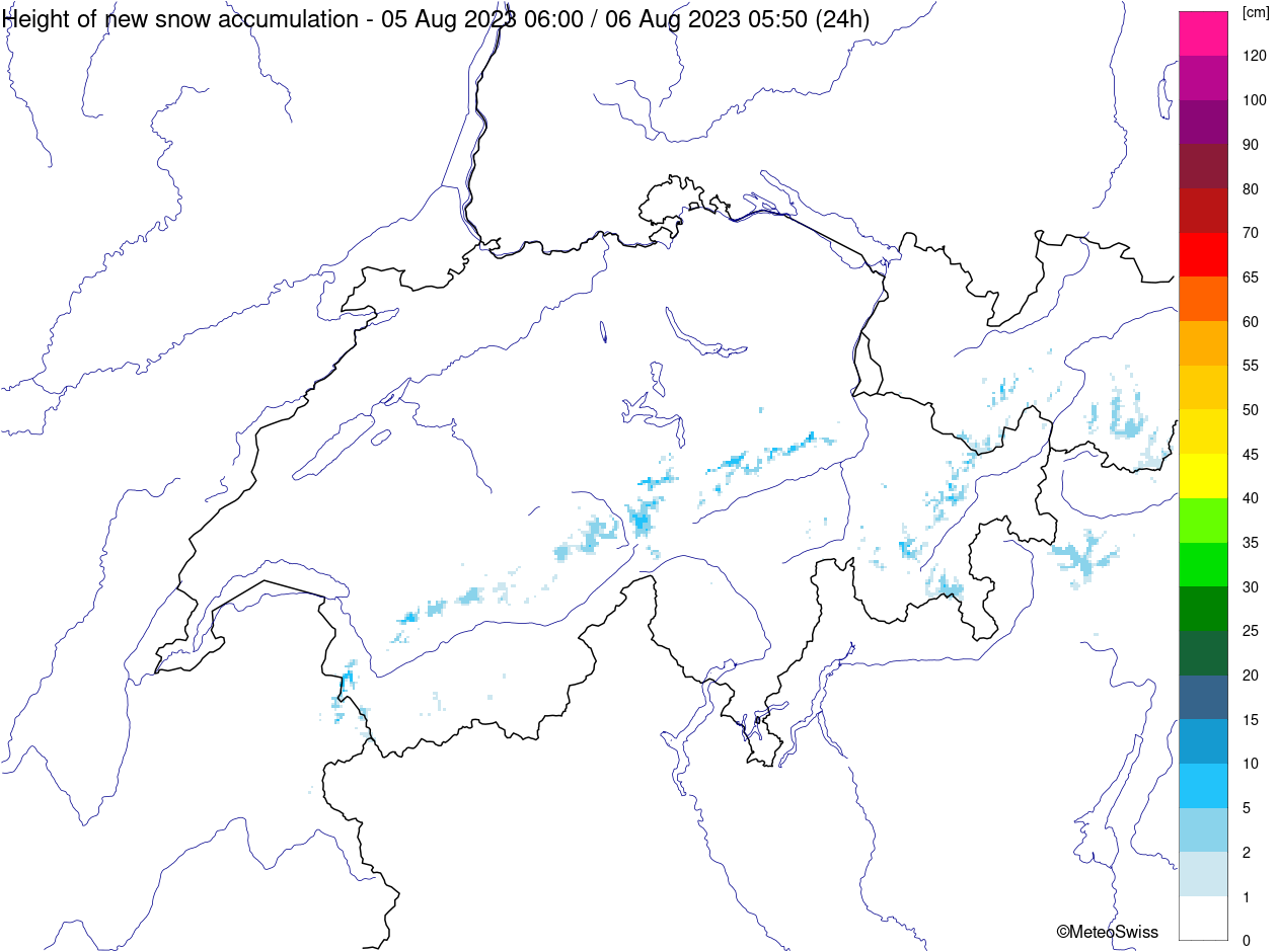 Alors que le temps des semaines précédentes offrait déjà un mélange variable de soleil et de pluie en montagne, de la neige fraîche s'est annoncée en montagne à partir du vendredi 4 août. Avec un vent souvent fort de nord à nord-ouest, les précipitations étaient surtout marquées dans le nord et le temps était souvent nuageux et humide pendant toute cette phase. Ce n'est que le samedi que l'air s'est asséché temporairement. Le vendredi et le samedi, la limite des chutes de neige se situait encore généralement au-dessus de 2500 mètres. Dans le courant de la journée du dimanche, elle s'est ensuite progressivement abaissée jusqu'à environ 2000 m. C'est ainsi que l'on a pu voir pour la première fois cet été des montagnes blanches sur une grande partie du territoire. Sur le versant sud des Alpes, le vent du nord a chassé les nuages, de sorte que le temps y était généralement ensoleillé. Dans le sud du Valais également, le soleil s'est souvent imposé.