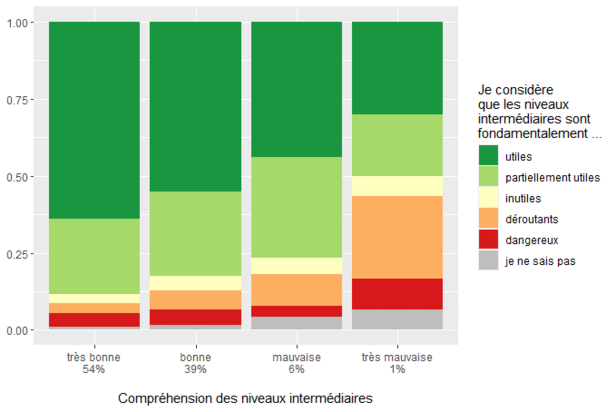 Les personnes qui comprennent bien les niveaux intermédiaires les considèrent comme utiles (colonnes de gauche dans la figure 5). On peut donc s'attendre à ce qu'une information accrue au cours des prochaines années améliore la compréhension et augmente ainsi encore l'utilité des niveaux intermédiaires.