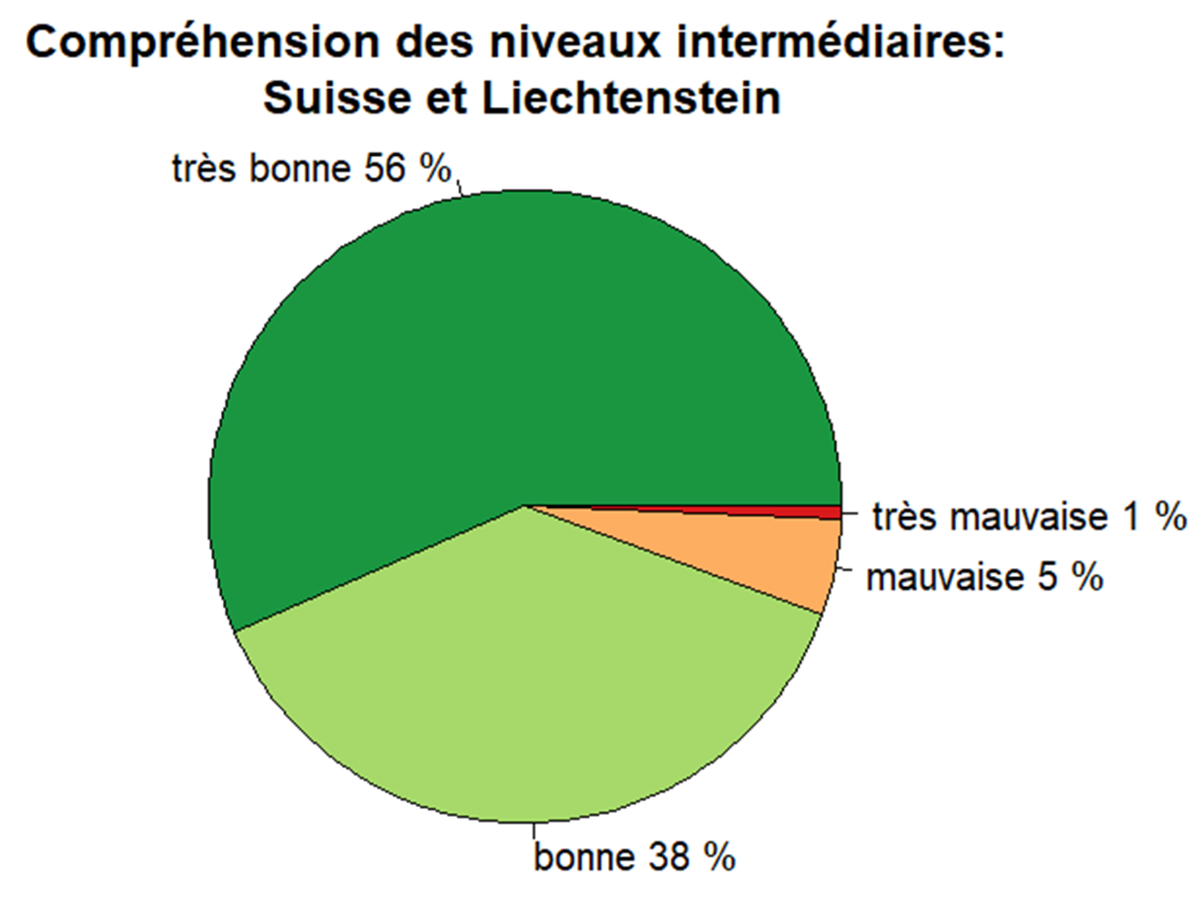 Nos voisins autrichiens et allemands ont exprimé leur inquiétude quant à une mauvaise interprétation des niveaux intermédiaires, car dans leur système de notation scolaire, la note s'améliore comme suit : 3+, 2-, 2, 2+, ... . Heureusement, l'enquête montre une bonne compréhension des niveaux intermédiaires, même chez les personnes qui pratiquent les sports d’hiver principalement dans ces pays (n=296). Mais avec 88% de vert foncé ou clair, elle est effectivement un peu moins bonne qu'en Suisse (figure 4). Nous ne savons pas encore si cette différence est réellement due au système de notation scolaire ou simplement la conséquence d'une expérience encore plus faible avec les niveaux intermédiaires.