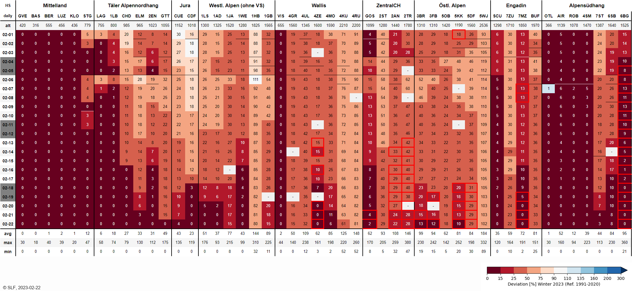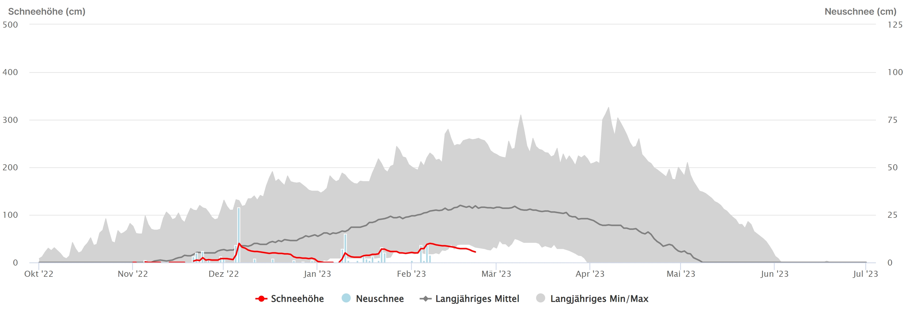 En raison des chutes de pluie plus fréquentes que les chutes de neige, même un hiver "seulement" très pauvre en précipitations comme celui de 2023 peut conduire à des minima records de cumul de neige fraîche. C'est ainsi que cet hiver, les chutes de neige fraîche cumulées depuis le 1er novembre pour 23 des 104 stations situées à plus de 1000 m d'altitude et effectuant des relevés depuis de nombreuses années n'ont encore jamais été aussi faibles. En moyenne, les stations situées entre 1000 et 2000 m n'affichent que 135 cm de cumul de neige fraîche, au lieu des 320 cm habituels à cette date.