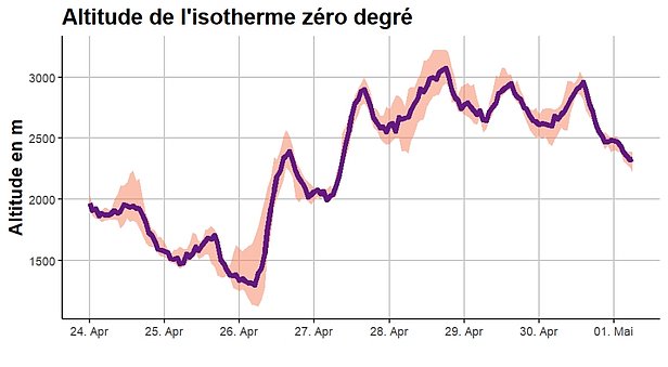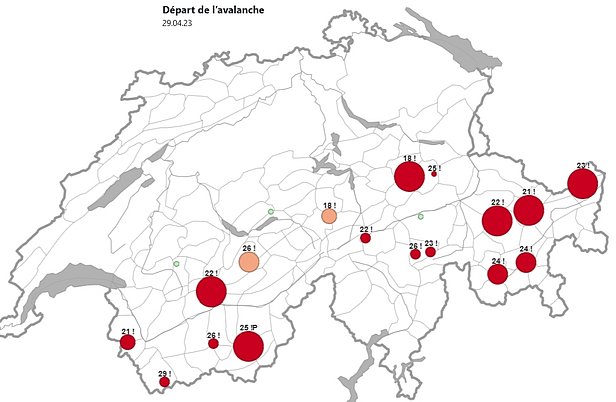 Entre le jeudi soir 27 avril et le samedi midi 29 avril, des précipitations sont tombées sur une grande partie du territoire, le vendredi d'abord principalement sur l'est, puis le samedi surtout dans l'ouest (cf. figure 1). La limite des chutes de neige est montée temporairement jusqu'à 2800 m, de sorte qu'il a neigé surtout en haute montagne. Sur la crête nord des Alpes entre Les Diablerets et le Sustenhorn ainsi que dans le Bas-Valais, on a enregistré de 20 à 40 cm de neige fraîche au-dessus de 3000 m (cf. figure 2). En dessous de 2400 m environ, les précipitations sont tombées intégralement sous forme de pluie.