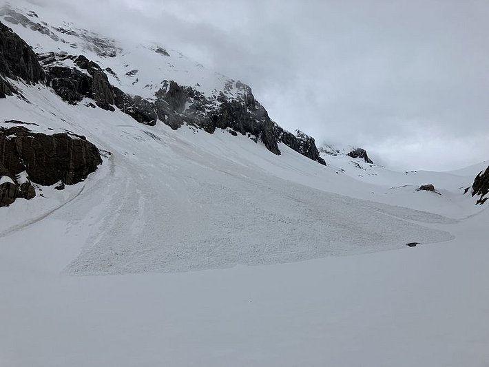 Le danger d'avalanches de neige mouillée a nettement augmenté et constituait le danger principal, en raison de la pluie, de la douceur du temps et du manque de rayonnement nocturne. Sous l'effet de la pluie et de l’ensoleillement, quelques avalanches de neige mouillée et de glissement se sont décrochées les 27 et 28 avril, mais surtout le samedi 29 avril, il y a eu de nombreuses grandes avalanches de neige mouillée et de glissement, et parfois même de très grandes avalanches de neige mouillée (cf. figure 4 et photo 5). Les avalanches se décrochaient souvent sur une grande superficie. En raison des faibles hauteurs de neige, les dépôts étaient cependant relativement petits par rapport aux largeurs de rupture. Le dimanche 30 avril, l'activité avalancheuse a diminué.