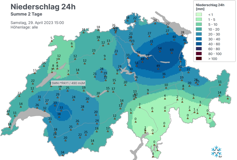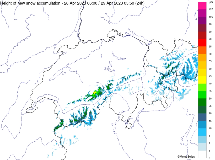 Entre le jeudi soir 27 avril et le samedi midi 29 avril, des précipitations sont tombées sur une grande partie du territoire, le vendredi d'abord principalement sur l'est, puis le samedi surtout dans l'ouest (cf. figure 1). La limite des chutes de neige est montée temporairement jusqu'à 2800 m, de sorte qu'il a neigé surtout en haute montagne. Sur la crête nord des Alpes entre Les Diablerets et le Sustenhorn ainsi que dans le Bas-Valais, on a enregistré de 20 à 40 cm de neige fraîche au-dessus de 3000 m (cf. figure 2). En dessous de 2400 m environ, les précipitations sont tombées intégralement sous forme de pluie.