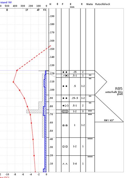 A une distance d'à peine 200 m au-dessus de la rupture se trouve la station automatique IMIS de Mällige (OBW3, 2194 m) et, le 16 mars, un profil de neige avait été relevé (cf. figure 3) à une distance d'à peine 500 m au-dessus de la rupture et à une altitude plus élevée de 100 m.
