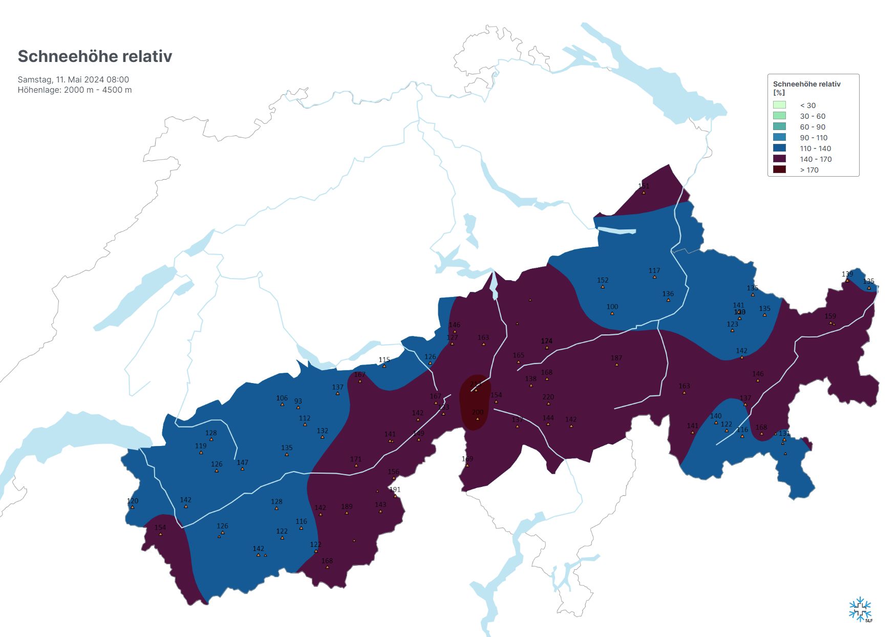 Au-dessus de 2000 m environ, il y avait encore nettement plus de neige que d'habitude en cette saison. Du sud du Haut-Valais jusqu'aux Grisons en passant par la Suisse centrale et le nord du Tessin, plusieurs stations de mesure automatiques ont enregistré environ une fois et demie la hauteur de neige habituelle pour cette période de l'année (cf. figure 2).