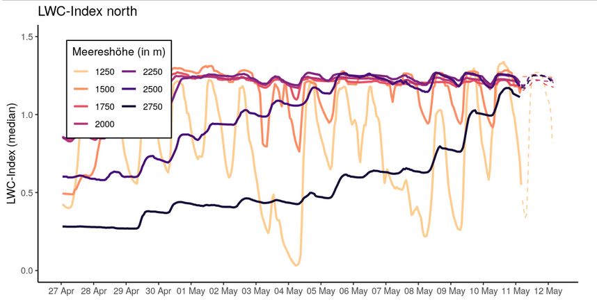 Avec l'humidification des pentes exposées au nord jusqu'en haute montagne, la publication des bulletins d'avalanches quotidiens a été arrêtée. Le dernier bulletin d'avalanches quotidien a été diffusé pour le 12 mai. En altitude, il y avait encore beaucoup de neige pour la saison. Il y avait donc toujours un potentiel d'avalanches - surtout d'avalanches de neige mouillée.