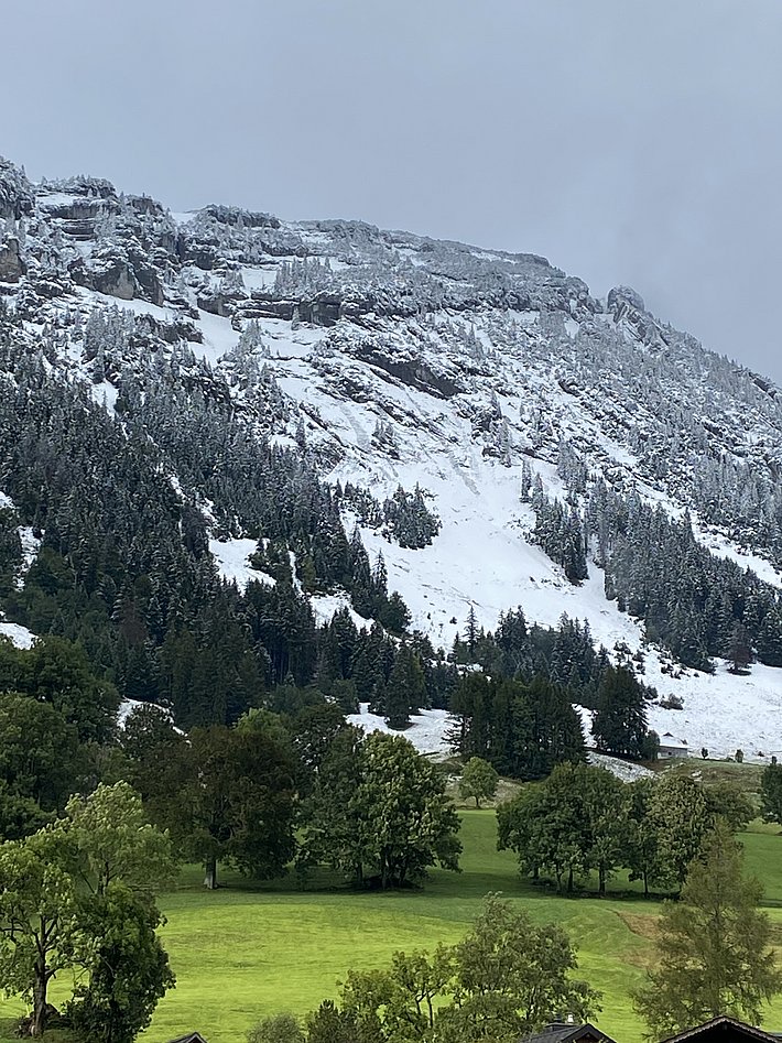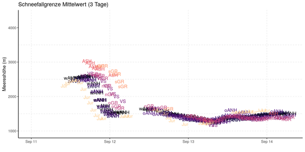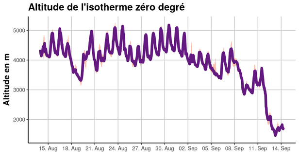 Du 11 au 14 septembre 2024, une incursion d'air froid a entraîné un refroidissement marqué. La limite des chutes de neige s'est rapidement abaissée dans la nuit du 12 septembre jusqu'à des altitudes moyennes, où elle est restée jusqu'au 14 septembre (cf. figure 3).