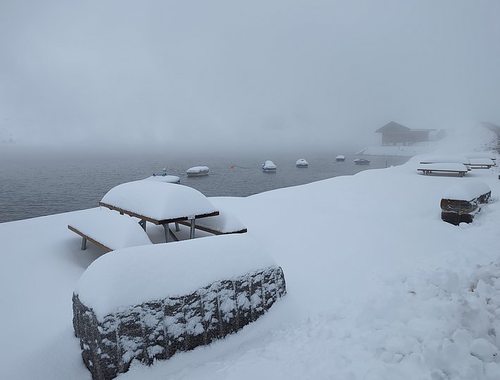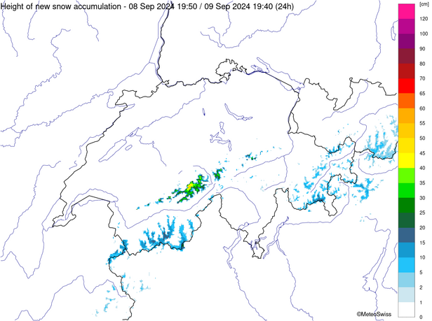 Les prochaines chutes de neige ne se sont pas fait attendre. Les 8 et 9 septembre, de 50 à 80 mm de précipitations sont tombés depuis le Sottoceneri jusqu'en Haute-Engadine, et la limite des chutes de neige est descendue de 3400 à 2600 m environ. Dans la région de la Bernina, environ 50 cm de neige sont tombés au-dessus de 3500 m environ. Il n'y a toutefois pas eu de confirmation sur le terrain. Par la suite, de 20 à 40 cm de neige sont encore tombés sur le versant nord des Alpes au-dessus de 3000 m environ (cf. figure 2).