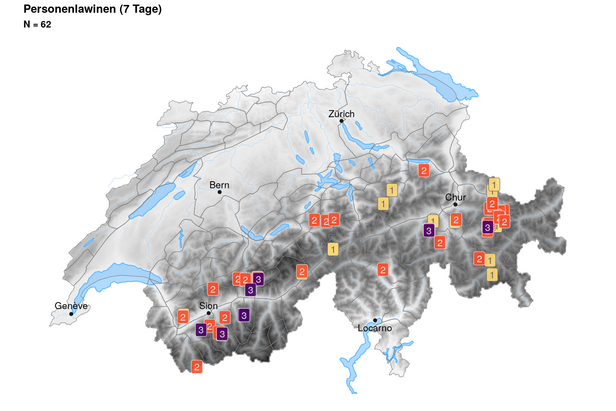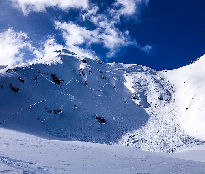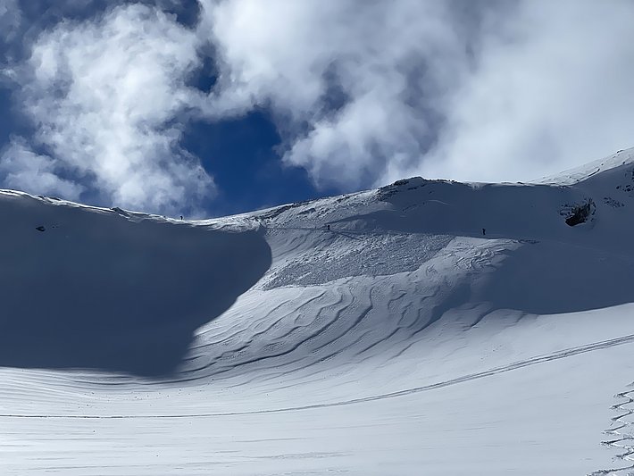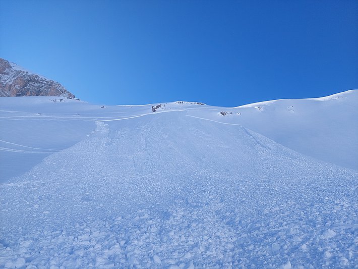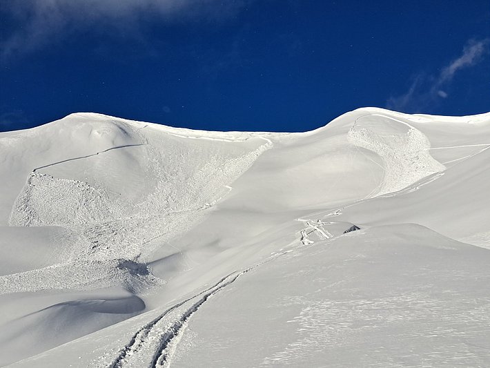 Ainsi, au cours du week-end, de nombreuses avalanches déclenchées par des personnes ont été signalées (figure 12). Dans la plupart des cas, l'influence du vent était le facteur déterminant. Les avalanches se déclenchaient surtout dans les couches supérieures du manteau neigeux dans la neige fraîche et la neige soufflée et atteignaient souvent une taille moyenne. Des ruptures dans les couches plus profondes n'ont pratiquement pas été signalées. Sur les pentes abritées du vent, on trouvait encore de la neige poudreuse.