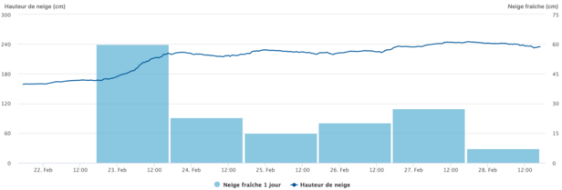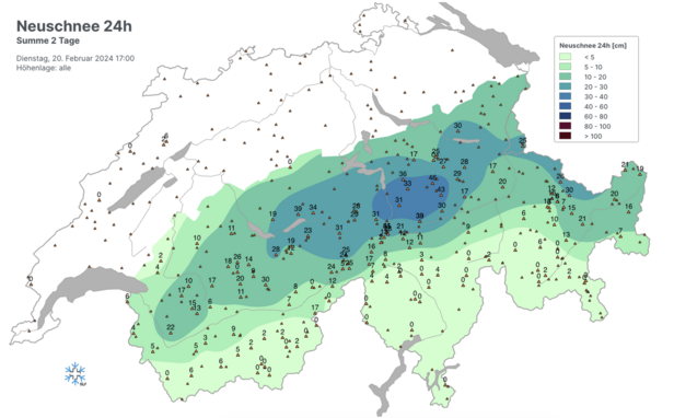 Du lundi au mardi 20 février, il a enfin neigé dans le nord. Dans les Alpes uranaises, on a mesuré jusqu'à 50 cm de neige fraîche au-dessus de 1800 m (figure 2).