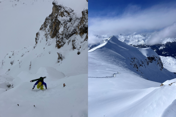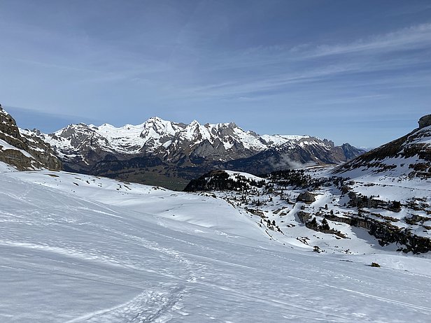 Les dernières fortes chutes de neige ont à nouveau eu lieu dans le sud: Au cours de la deuxième semaine de février, de 60 à 80 cm de neige sont tombés dans certaines parties du Tessin (Avablog 8.-12. février). Dans le nord, il n'était tombé que quelques centimètres au cours de cette période. Par la suite, il n'y a pas eu d’apport significatif de neige pendant plus d'une semaine. De plus, il faisait particulièrement doux, ce qui a donné lieu à des conditions printanières. Comme le rapporte MétéoSuisse, il s'agit du mois de février le plus doux et également de l'hiver météorologique le plus doux depuis le début des mesures (MétéoSuisse-Blog). Des descentes dans de la neige de printemps s’imposaient déjà en février et, sur les pentes exposées au sud, il fallait tenir compte de la limite d’enneigement pour les randonnées (photo 1).