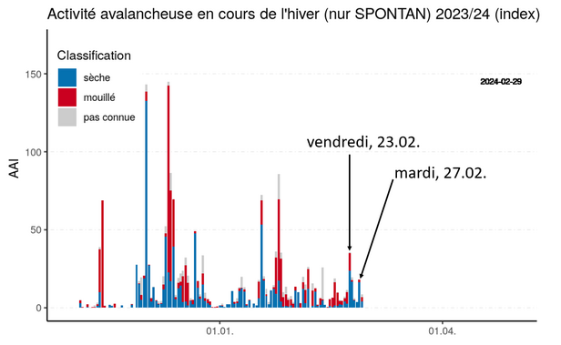 Nombreuses avalanches déclenchées par des personnes le week-end des 24 et 25 février, surtout à cause de la neige soufflée ¶