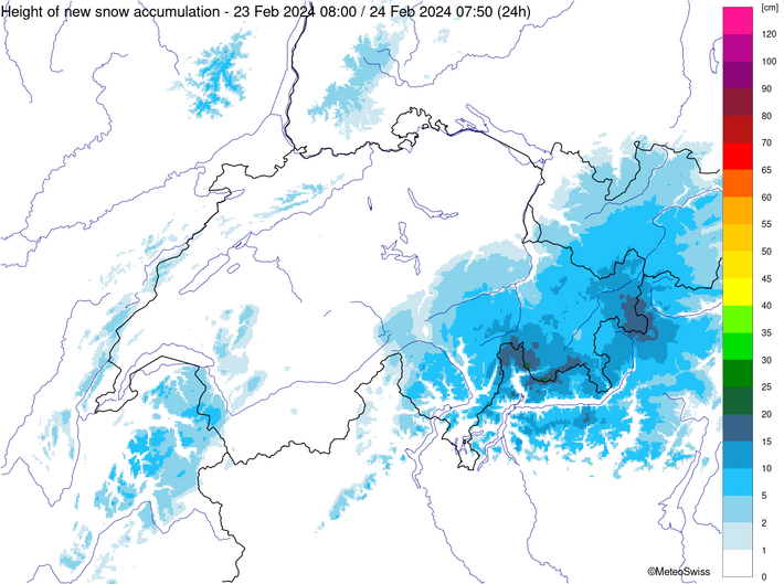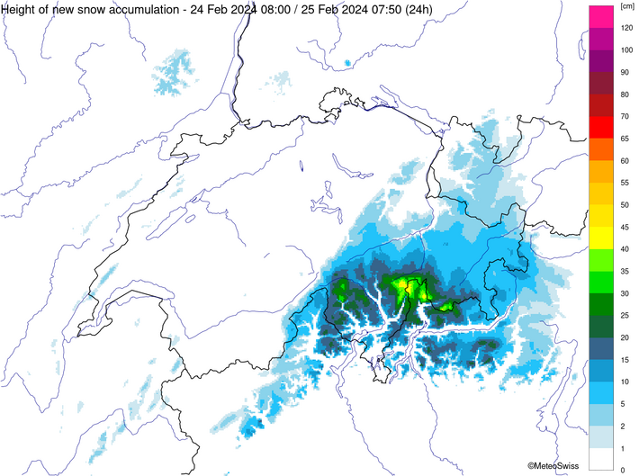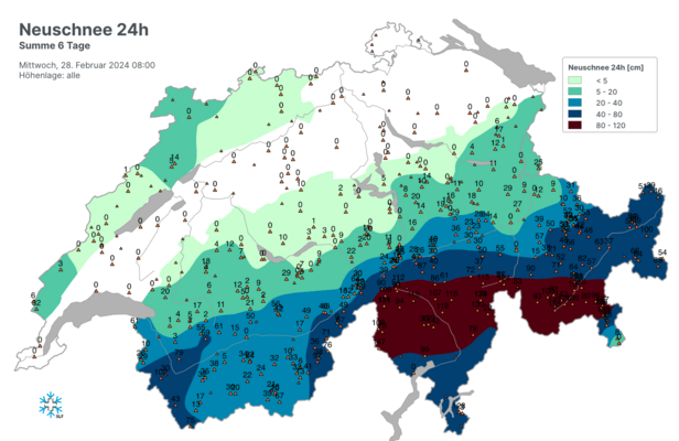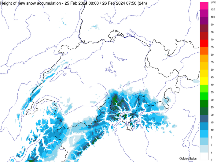 Les chutes de neige n'avaient cependant pas encore cessé. Une situation marquée de barrage météorologique côté sud s'est installée (photo 6). Jusqu'à la fin de la période de précipitations, le mercredi matin 28 février, de 10 à 30 cm supplémentaires de neige ont été mesurés quotidiennement dans le sud. Le cœur des précipitations se situait alors temporairement un peu plus à l'est dans la région de la Bernina ou encore un peu plus à l'ouest sur la crête principale des Alpes du Haut-Valais (figure 4).