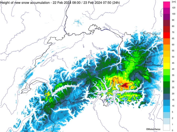Le jeudi 22 février, un front froid a atteint la Suisse (MétéoSuisse-Blog). Il a d'abord apporté d’abondantes précipitations dans l'ouest: Dans l'extrême ouest du Bas-Valais, jusqu'à 40 cm de neige sont tombés jeudi soir (figure 4a). La limite des chutes de neige est descendue depuis 1800 m environ jusqu'à basse altitude (figure 3).