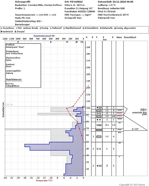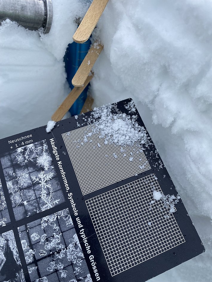 Des informations ponctuelles provenant du terrain (cf. photo 4), des profils spécifiques de neige (cf. figure 5) et les calculs effectués à l’aide du système Snowpack de modélisation du manteau neigeux indiquaient, avant les chutes de neige décrites ci-dessus, la présence de couches fragiles à grains anguleux dans le voisinage de croûtes de regel formées par les pluies de la semaine précédente. Certains déclenchements à distance montraient également que les couches étaient susceptibles de se décrocher. Mais en raison de la faible densité d'informations, on savait toutefois peu de choses sur la répartition de ces éventuelles couches fragiles, si ce n'est qu'elles étaient présentes jusque loin en direction du Tyrol . En revanche, on savait que les couches relativement profondes du manteau neigeux étaient généralement bien consolidées et stables.