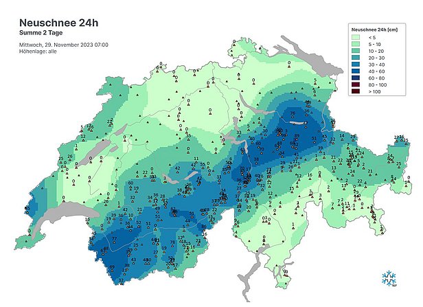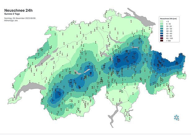 Entre le dimanche 24 novembre et le mercredi 29 novembre, il a neigé abondamment dans le nord au cours de deux épisodes successifs. La neige est tombée temporairement jusqu'en plaine. Le degré de danger 4 (fort) était annoncé pour la nuit de samedi à dimanche. Ce degré de danger n'a cependant pas pu être confirmé rétrospectivement.