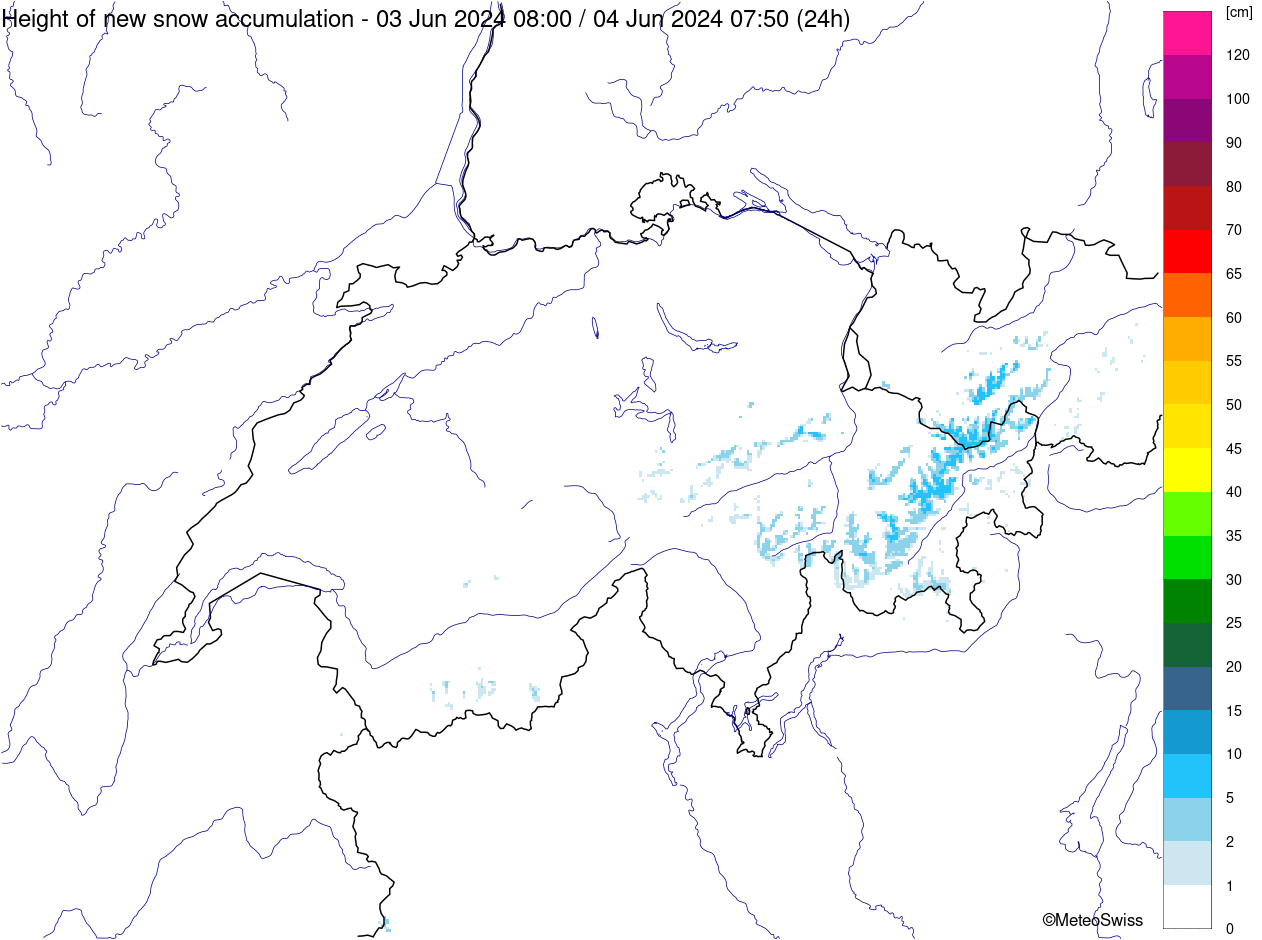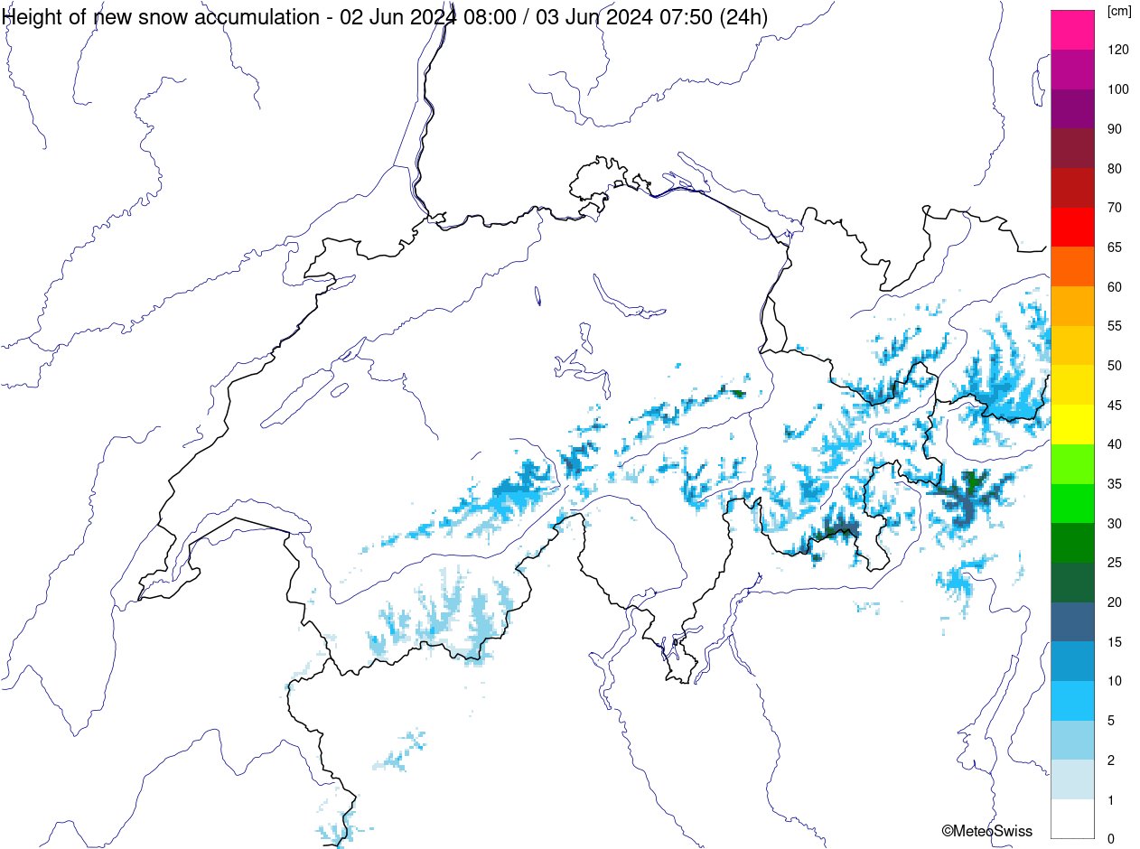 Les jours du 29 mai au 1er juin, les précipitations étaient intensives et sur la crête nord des Alpes depuis l'est des Alpes bernoises jusqu'au Liechtenstein ainsi que dans les Grisons, on a enregistré au-dessus de 2500 m environ de 40 à 60 cm de neige, et localement jusqu'à 70 cm, surtout dans les Grisons. Après une pause dans les précipitations le dimanche 2 juin, la nébulosité était variable à forte jusqu'au 4 juin dans le nord et de nouvelles précipitations sont tombées temporairement avec une montée de la limite des chutes de neige. En haute montagne, c'est-à-dire au-dessus de 3000 m environ, on a enregistré de 10 à 20 cm de neige fraîche sur une grande partie du territoire et jusqu'à 30 cm dans les Grisons. Les quantités journalières de neige fraîche sont représentées dans la galerie de photos de la figure 2.