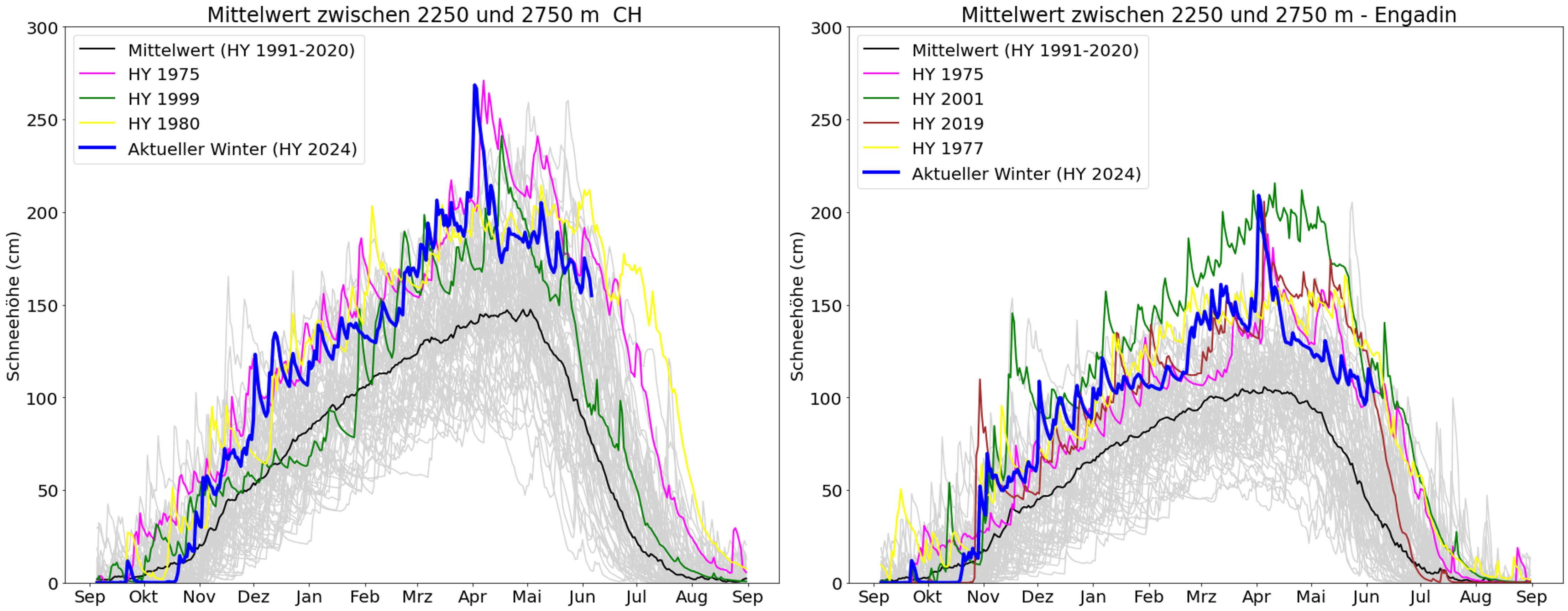 Avec les précipitations de cette période examinée, les hauteurs de neige ont à nouveau nettement augmenté dans certaines régions, de sorte qu'au début du mois de juin, à 2500 m, elles représentent pour l'ensemble de la Suisse un peu plus de 200 % de la moyenne pluriannuelle (1991-2020). Il faut remonter à 1984 (c'est-à-dire il y a 40 ans) pour trouver des quantités de neige encore plus importantes à cette altitude début juin (figure 3, à gauche). En Engadine, comme d'habitude, il y a certes moins de neige en valeur absolue que dans le reste des Alpes suisses. Mais en termes relatifs, les hauteurs de neige à 2500 m sont actuellement encore plus exceptionnelles en Engadine. En effet, on y enregistre actuellement 260 % de la moyenne pluriannuelle. C'était le cas début juin pour la dernière fois en 2019 (figure 3, à droite). Il en va de même pour les 90 années de mesures au Weissfluhjoch, où (à l'exception de 2019) on n'a plus mesuré autant de neige début juin depuis 40 ans (actuellement 220 cm).