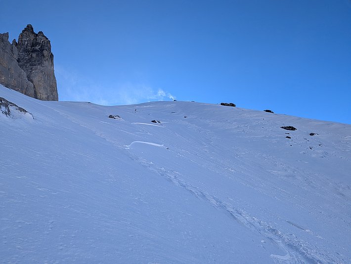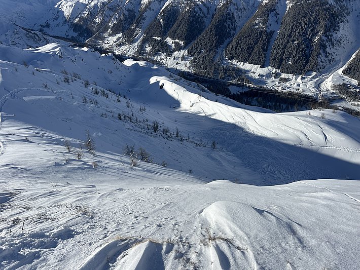 Les tailles des avalanches illustrent les situations différentes des deux week-ends. Le week-end du 11 au 12 janvier, les accumulations de neige soufflée étaient nettement plus étendues et plus épaisses en raison des chutes de neige précédentes (Figure 1). De plus, dans les régions intra-alpines, les avalanches se sont également déclenchées plus profondément dans la neige ancienne. Ainsi, les avalanches étaient souvent plus grandes. Le samedi 18 janvier, en revanche, seule la neige ancienne meuble proche de la surface a été transportée par le vent donnant lieu à la formation d'accumulations plutôt minces de neige soufflée. C'était surtout le cas dans les régions touchées par le foehn sur le versant nord des Alpes ainsi que, d'une manière générale, dans le voisinage des crêtes et des cols (cf. photos). Les accumulations de neige soufflée formées par le transport de neige ancienne par le foehn se consolident rapidement (par frittage, c'est-à-dire par la fusion des cristaux de neige). Ainsi, le lendemain, la plaque de neige est souvent déjà trop dure pour la propagation de la rupture et donc pour le déclenchement d'une avalanche.