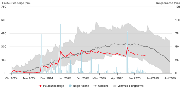 Le 10 mai, le dernier bulletin ordinaire de la saison 2024/25 a été publié. En haute montagne, les randonneurs à ski ont encore rencontré des conditions hivernales (Fig. 1). Le temps instable de ces derniers jours a provoqué des averses de neige locales. Avec des vents de secteur nord, des accumulations de neige soufflée se sont formées en altitude, parfois instables.