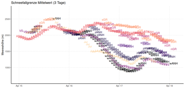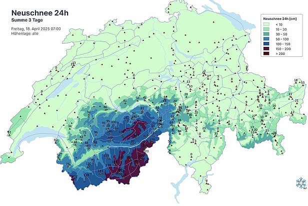 La phase la plus intense des précipitations allait du mardi soir 15 avril au jeudi midi 17 avril. Au total, les quantités suivantes de neige ont été mesurées au-dessus de 2200 m environ (cf. figure 3) :