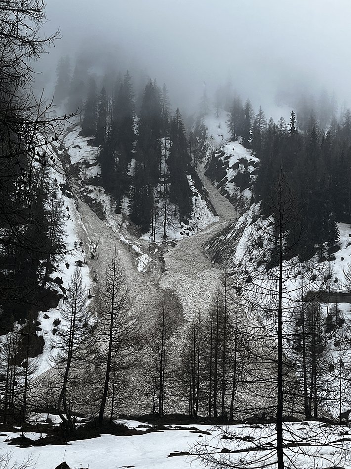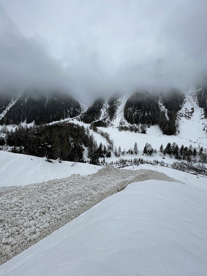 Il y avait ici beaucoup d'incertitude dans l'évaluation. Dans ses prévisions, le service de prévisions des avalanches s'attendait à une limite des chutes de neige plus élevée, surtout dans les principales régions touchées par les précipitations. En raison de l'abaissement plus rapide de la limite des chutes de neige, des quantités considérables de neige ont été mésurées en Valais, même aux altitudes moyennes, et ont été entraînées par de grandes avalanches dans les couloirs d'écoulement.