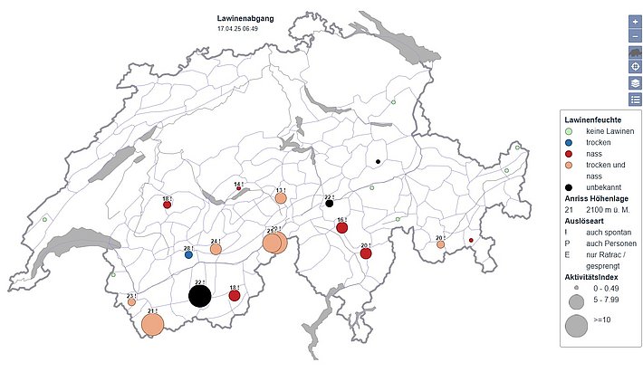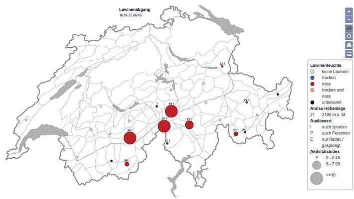 Une première impression laissait toutefois supposer que le degré de danger d'avalanche 4 (fort) était pertinent. De nombreuses grandes avalanches et quelques très grandes avalanches ont été signalées et les systèmes de détection des avalanches ont indiqué de nombreux départs pendant la phase principale des précipitations. Au Grand Saint-Bernard, une avalanche a touché la galerie de la route et a provoqué des dégâts. D'autres avalanches ayant entraîné des dommages ou des avalanches extrêmement grandes n'avaient pas été signalées au moment de la publication de cet AvaBlog (figure 5).