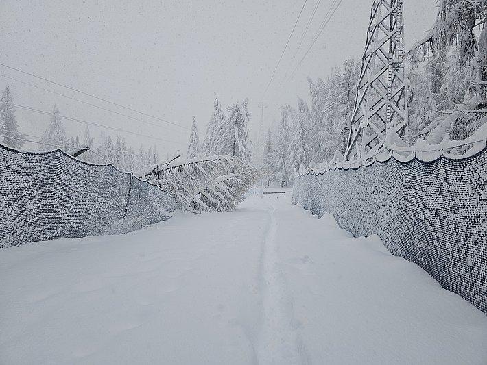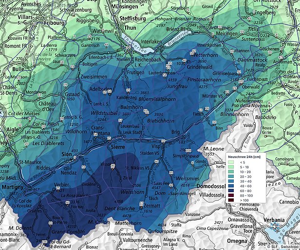 La prévision de la limite des chutes de neige était plus difficile. Dans le nord-ouest, une baisse rapide de la limite des chutes de neige avec l'air froid était attendu, alors que sur le versant sud des Alpes, la limite des chutes de neige restait élevée. Mais, en particulier dans les principales régions touchées par les précipitations dans le sud du Haut-Valais, la situation est restée longtemps incertaine quant à savoir si la limite des chutes de neige allait baisser et à quelle vitesse.
