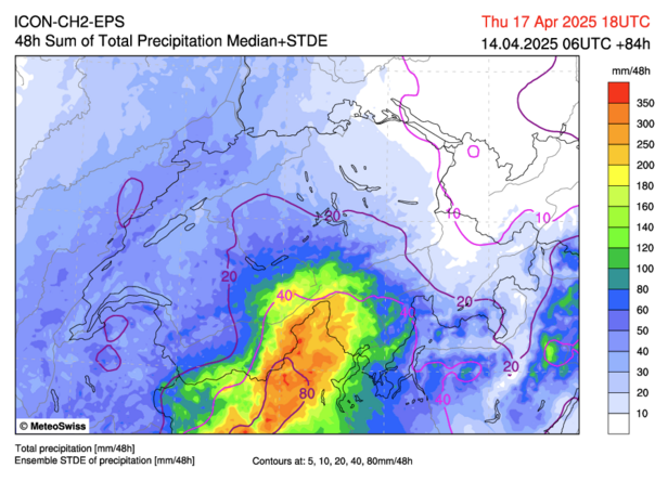 Les quantités extraordinaires de précipitations ont été causées par une situation de courants opposés. Du sud, de l'air chaud avec beaucoup d'humidité a été transporté vers le versant sud des Alpes, tandis que de l'air plus frais s'est infiltré dans les basses couches de l'atmosphère depuis le nord-ouest sur le versant nord des Alpes. L'arrivée de l'air chaud sur le versant sud des Alpes et sur l'air froid a provoqué des précipitations très intenses, qui étaient déjà bien prévues par les modèles météorologiques dès dimanche (figure 1). Le lundi, les services de sécurité ont été informés par le SLF et MétéoSuisse des précipitations intenses et de l'augmentation du danger d'avalanche par une pré-information sur les fortes chutes de neige. Le mardi, une pré-alerte neige et danger d'avalanche a été émise avec une probabilité de 10 à 40 % pour le degré 5 (très fort danger d'avalanche) pour les principales régions touchées par les précipitations. Ce niveau a été relevé mercredi à une probabilité de 40 à 70 %.