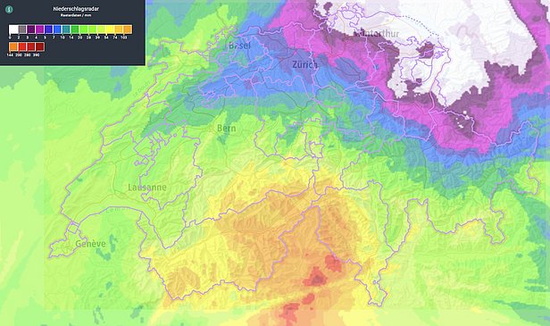 Alors que les quantités de précipitations à l'ouest, où la limite des chutes de neige est plus basse, peuvent être bien représentées par les sommes de neige fraîche, elles ne sont guère visibles sur la représentation ci-dessus au sud des Alpes, où la limite des chutes de neige se situait en permanence entre 2200 et 2400 m. La somme des précipitations sur l'image radar donne une meilleure image (figure 4).