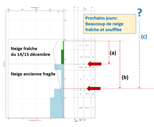 Cette situation de neige ancienne a peu évolué. Dans presque toutes les régions, on trouve sur les pentes exposées à l'ouest, au nord et à l'est des couches fragiles marquées dans la partie supérieure et centrale du manteau neigeux généralement encore mince. Examinons par exemple un profil de neige relevé le mercredi 18 décembre à près de 2800 m sur une pente exposée au nord-est au-dessus d'Arolla (VS). A cet endroit, le manteau neigeux avait une épaisseur d'environ 80 cm. 20 cm de neige fraîche du week-end (14 et 15 décembre) recouvraient un manteau neigeux ayant subi une métamorphose constructive et très meuble. Le manteau neigeux était certes stable à ce moment-là - et un déclenchement d'avalanche plutôt improbable, mais des couches fragiles potentielles se trouvaient à la transition entre la neige fraîche et la neige ancienne sous-jacente ainsi que dans la neige ancienne. Le vendredi 20 décembre, celles-ci se situaient entre 20 cm (a) et 50 cm (b) sous la surface. Au cours des cinq jours suivants, nous attendons un demi-mètre, voire un mètre de neige fraîche dans le sud du Valais. Celle-ci tombera - pas seulement en Valais, mais presque partout - sur un manteau neigeux parsemé de couches fragiles. Nous (le service de prévision d'avalanche du SLF) partons du principe qu'avec la surcharge croissante due à la neige fraîche et à la neige soufflée, des avalanches se déclencheront spontanément pendant cette période. De plus, elles pourront aussi être déclenchées très facilement par les adeptes de sports de neige. Non seulement la neige fraîche, mais aussi une partie de la neige ancienne pourront être emportées. Des avalanches de taille dangereuse pour les adeptes de sport d'hiver sont attendues.