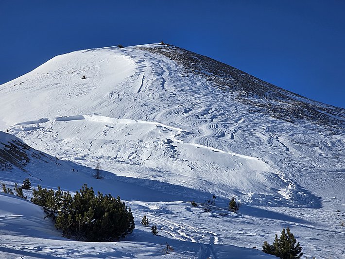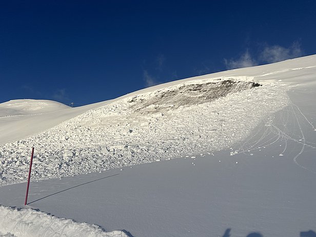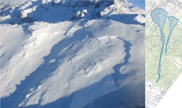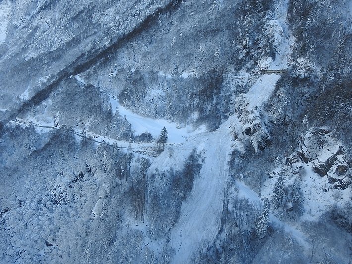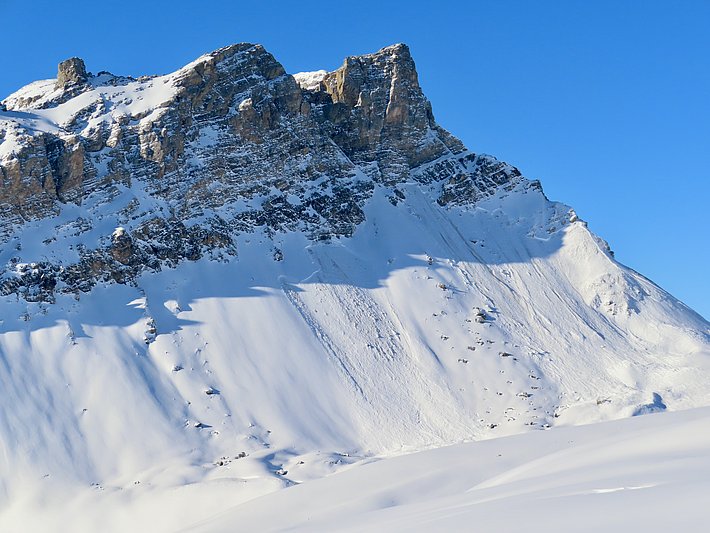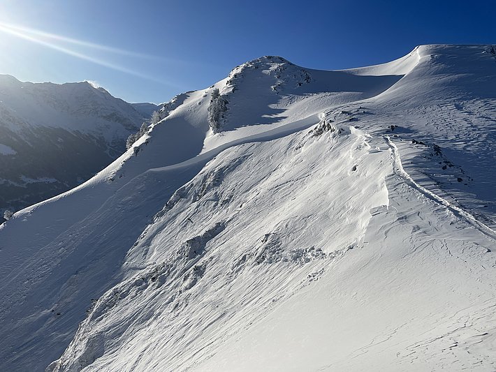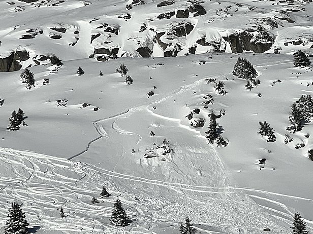Dans ces régions, la probabilité de déclenchement par des personnes reste plus longtemps élevée et le danger d'avalanche ne diminue que très lentement. Les avalanches déclenchées peuvent être de grande ampleur. Au sud, dans le centre et le sud des Grisons et dans le centre du Tessin, il y a toujours peu de neige. Le mince manteau de neige a généralement subi une métamorphose constructive complète et est meuble. Là où des accumulations de neige soufflée se sont déposées sur la neige ancienne en raison du fort vent du nord, elles sont et restent cependant fragiles. Là aussi, les avalanches peuvent prendre une ampleur dangereuse (cf. figure 7).