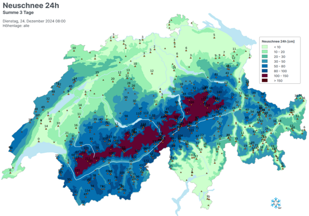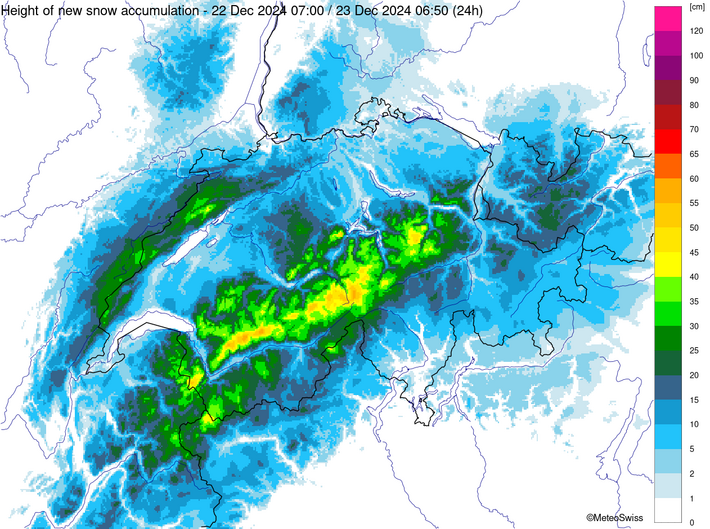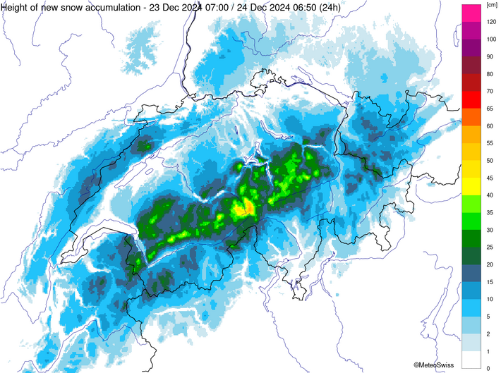 Les précipitations ont souvent été persistantes et intenses. La phase la plus intense a eu lieu le lundi matin 23 décembre le long de la crête nord des Alpes dans le Bas-Valais et l'Oberland bernois, où environ 50 cm de neige fraîche sont tombés en 6 heures.