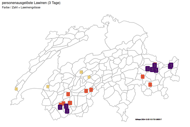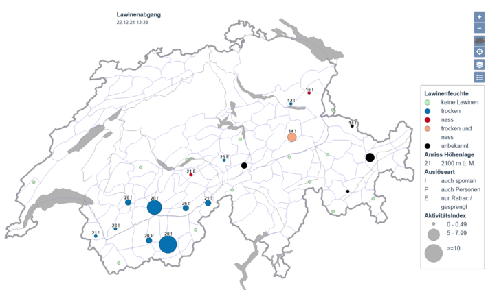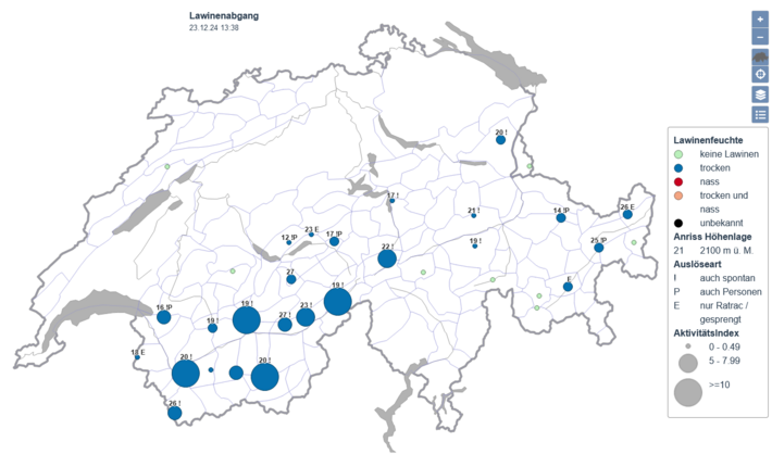 Les premières avalanches spontanées se sont déclenchées dès la nuit du samedi jusqu'au dimanche 22 décembre, comme l'ont montré les systèmes de détection des avalanches. Au début, les avalanches étaient plutôt petites, mais elles ont ensuite rapidement pris de l'ampleur avec la neige fraîche abondante. Le lundi 23 décembre, des avalanches spontanées de très grande taille ont été signalées. Avec une visibilité croissante le mardi à l'ouest et le jour de Noël à l'est, la "collecte des avalanches" n'était pas encore terminée au moment de la clôture de la rédaction. Il faut en outre tenir compte du fait que toutes les avalanches ne sont de loin pas observées et signalées. La figure 10 montre l'état des signalements reçus à la clôture de la rédaction à la mi-journée du jour de Noël.