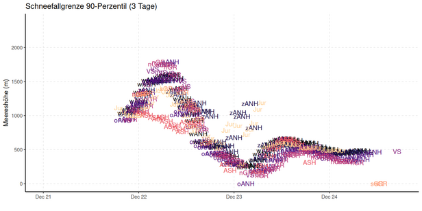 Après une journée assez ensoleillée, les précipitations annoncées ont commencé le samedi soir 21 décembre à partir du nord-ouest. La limite des chutes de neige est d'abord montée d'environ 1000 m à près de 2000 m (les observateurs ont même signalé une limite des chutes de neige à 2400 m dans l'ouest). Le dimanche, elle est ensuite rapidement descendue jusqu'à basse altitude (cf. figure 1), où elle est restée jusqu'à la fin des précipitations le mardi 24 décembre.