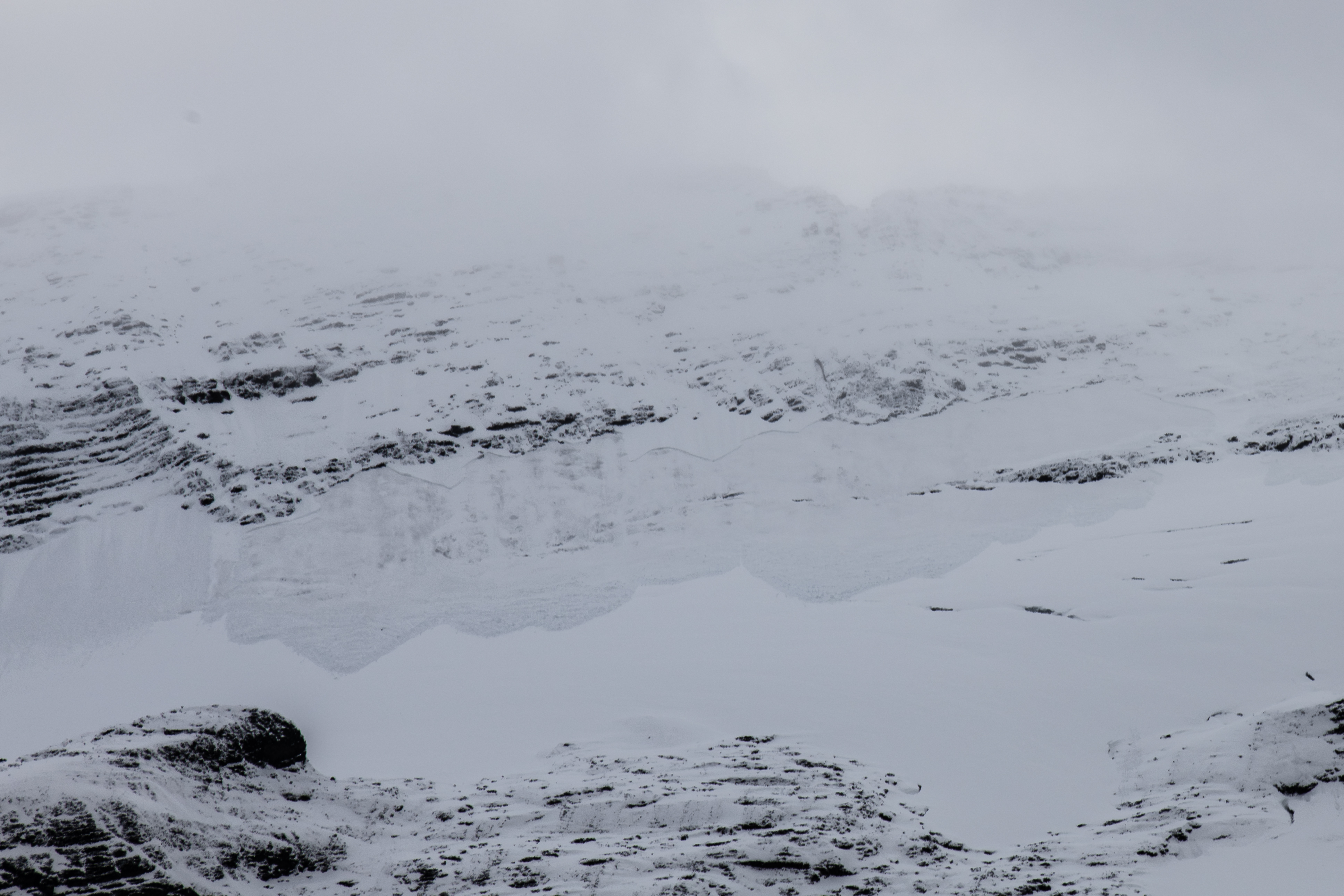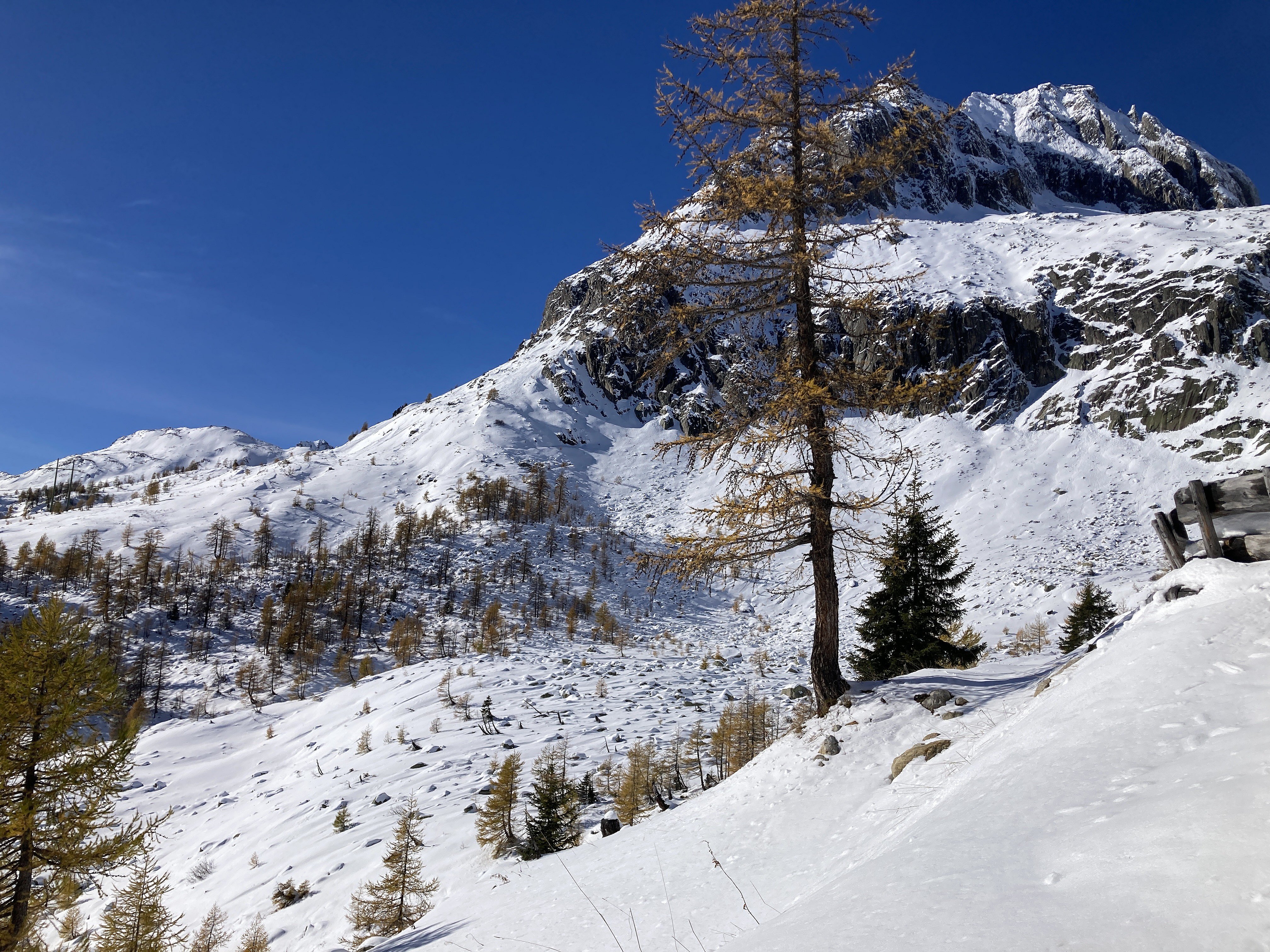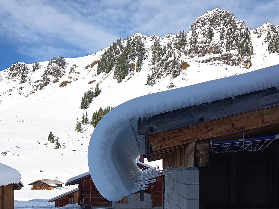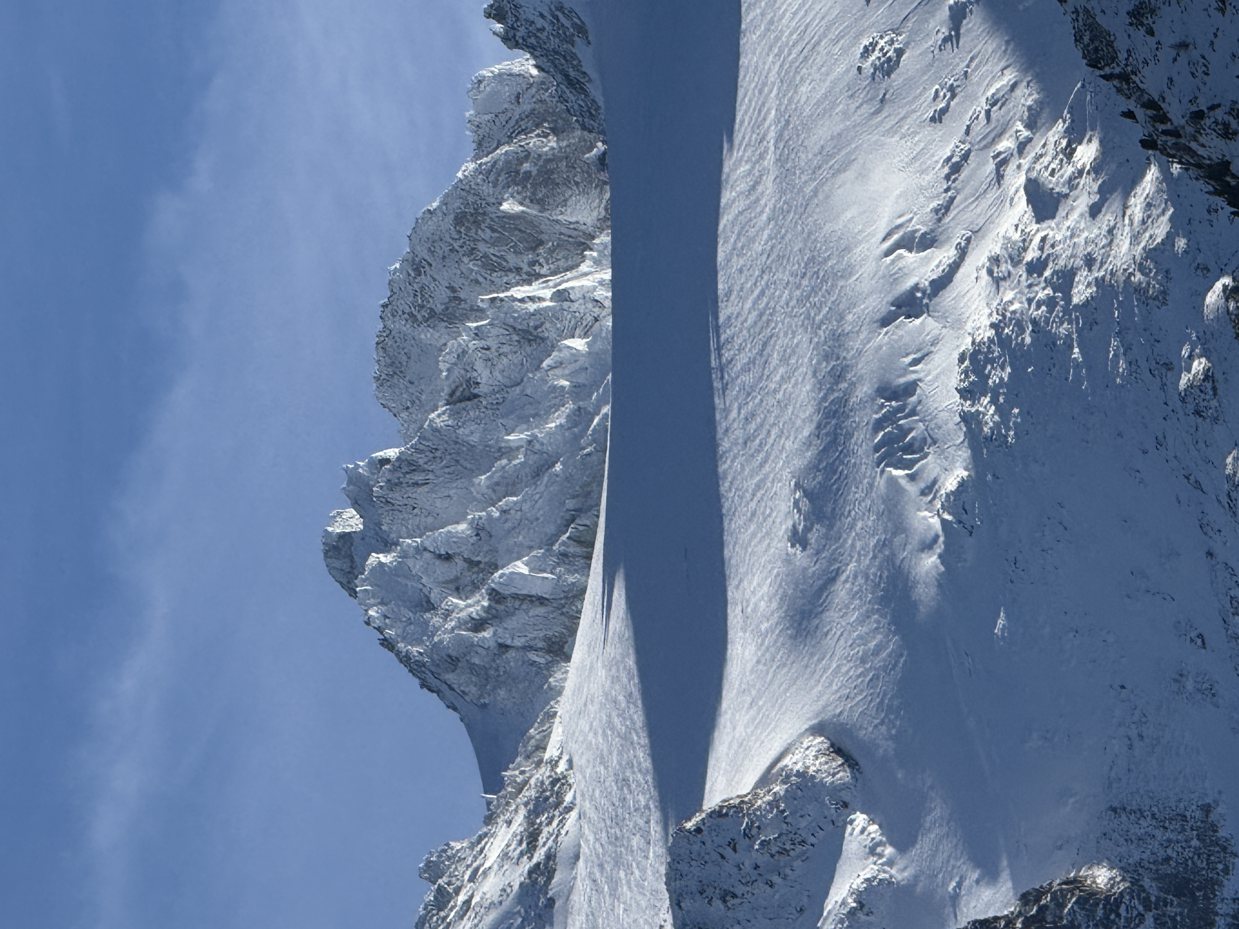 Après deux semaines sans précipitations notables, il y avait, au début de la période, un manteau neigeux continu surtout sur les versants ombragés au-dessus d’environ 2800 m, ainsi que dans les zones de haute montagne glaciaires. Le manteau neigeux ancien était en partie croûté, en partie métamorphosé à grains anguleux, constituant ainsi une base plutôt défavorable pour les chutes de neige de cette période. En dessous de 2800 m et sur les versants ensoleillés, la neige est tombée en grande partie sur un sol nu ou sur un manteau neigeux discontinu (cf. photo 1).