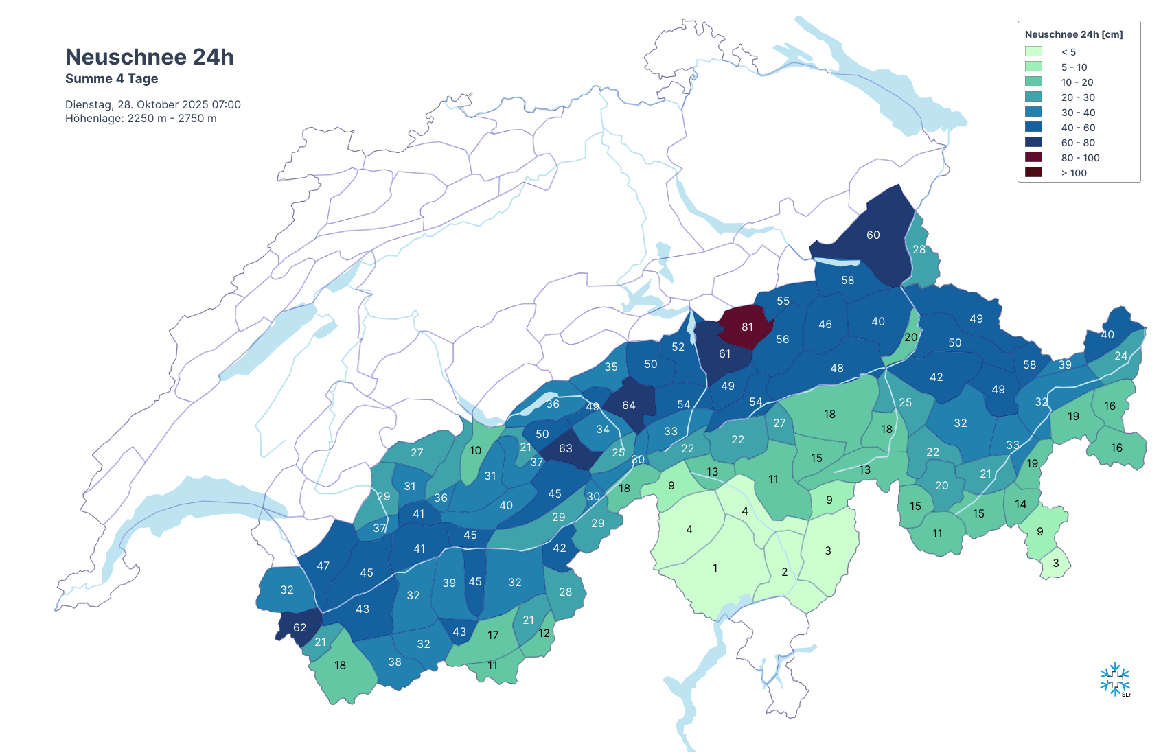 Les hauteurs de neige ont atteint des valeurs record pour un 28 octobre à 31 stations IMIS automatiques (avec 23 à 33 ans de mesures), principalement sur le versant nord des Alpes et en Valais. Cependant, les cumuls de neige fraîche n’étaient pas exceptionnels d’un point de vue climatologique.
