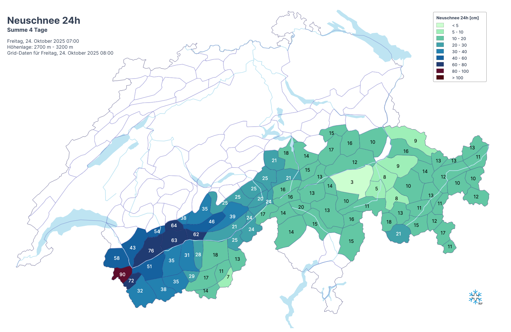 Le lundi 20 octobre, les chutes de neige ont commencé depuis l’ouest. La limite pluie-neige est d’abord montée de 2200 m à environ 2700 m, avant de redescendre le jeudi 23 octobre à environ 1200 m (cf. figure 2). Le vendredi 24 octobre, les précipitations se sont temporairement interrompues et le temps est devenu partiellement, voire assez ensoleillé à l’est et au sud. Les plus fortes chutes ont été enregistrées dans les hautes montagnes de l’ouest et du nord du Bas-Valais, avec 60 à 100 cm. Les cumuls sur quatre jours sont présentés dans la figure 3.