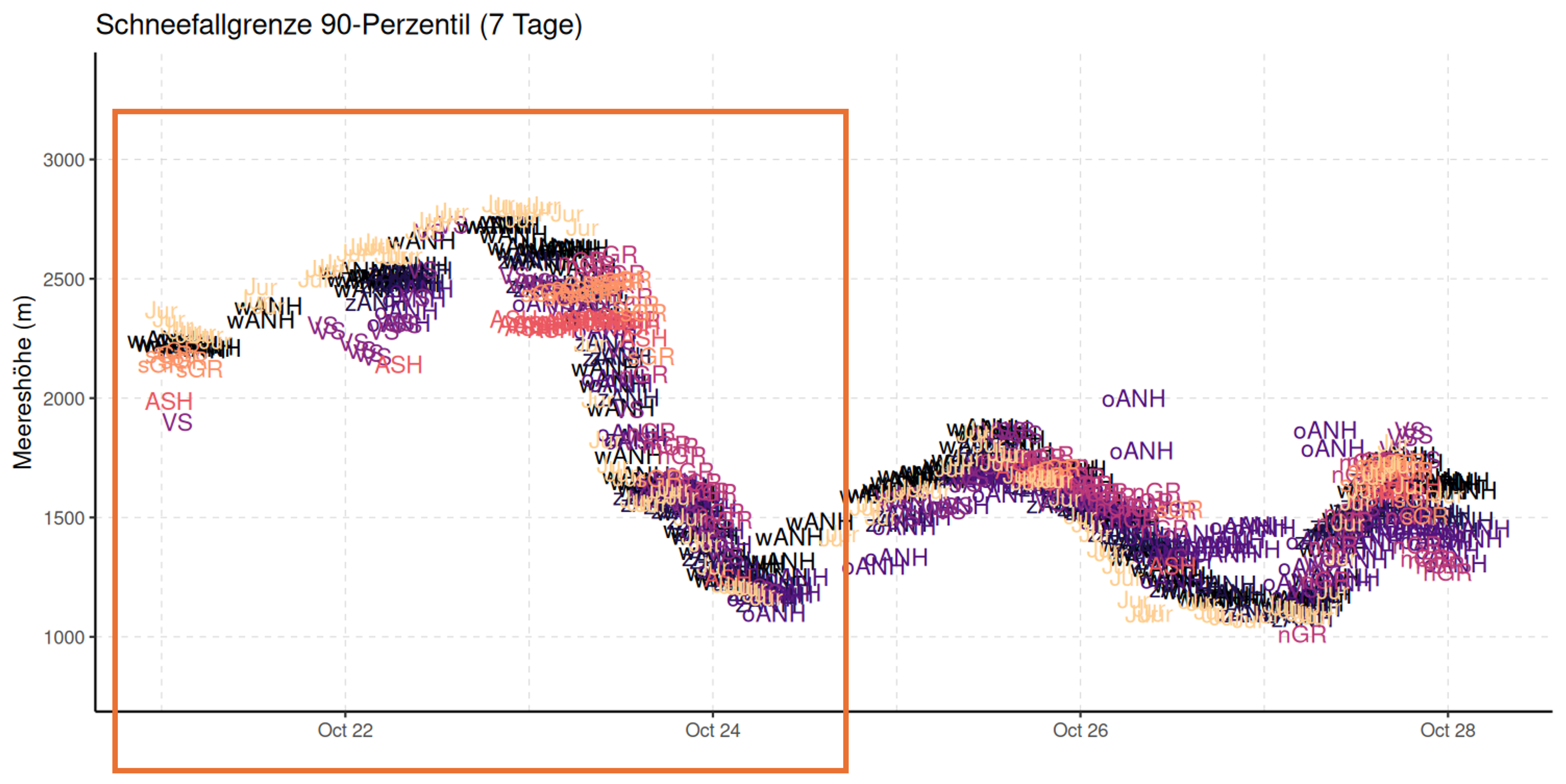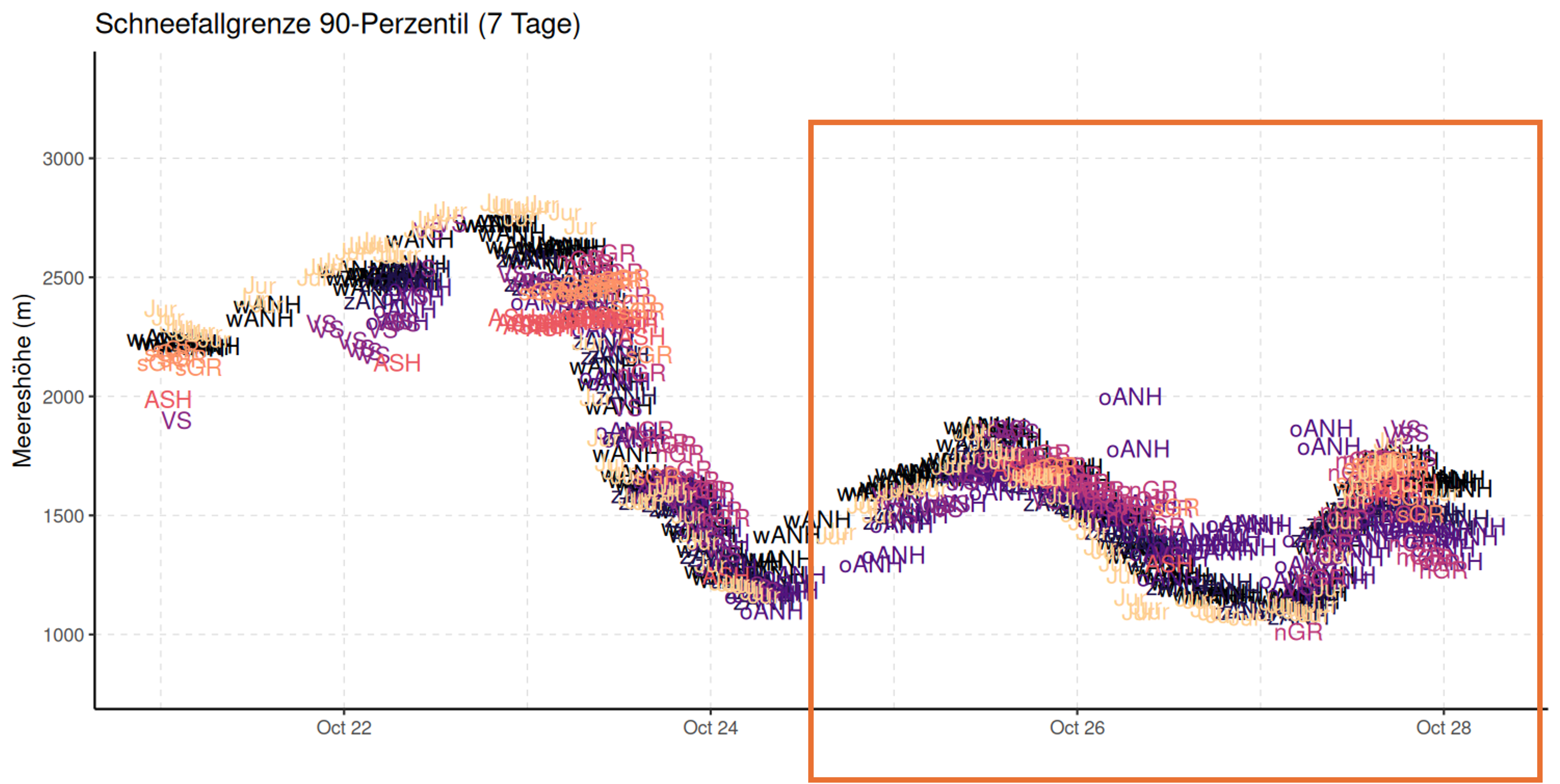 Le vent a continué à souffler fortement, parfois en tempête ; d’abord de l’ouest, puis du nord-ouest, entraînant un transport marqué de la neige poudreuse. Le mardi 28 octobre, le temps est devenu ensoleillé et la limite du zéro degré a dépassé 2500 m dans la journée.