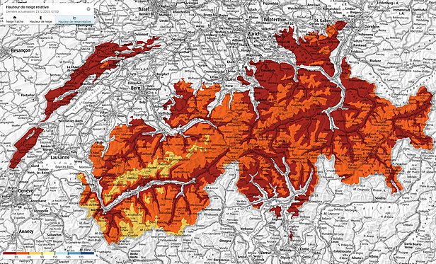 Pour finir, voici quelques informations générales sur la carte de hauteur de neige relative mentionnée ci-dessus. Au lieu de se baser sur une interpolation de la hauteur relative de neige mesurée dans différentes stations, la carte repose depuis peu sur la modélisation de la neige réalisée par le service opérationnel hydrologique de la neige du SLF (OSHD). Une variante simplifiée du modèle, adaptée aux applications climatologiques et aux longues séries de données, est utilisée à cet effet. Les hauteurs de neige issues de ce modèle sont calculées quotidiennement sur une grille de 1 km. Le modèle utilise comme données d'entrée les grilles de température et de précipitations basées sur les données de mesure de MétéoSuisse et les hauteurs de neige mesurées par 350 stations manuelles et automatiques du SLF et de MétéoSuisse. Le modèle fournit à la fois l'ensemble de données de référence pour les moyennes à long terme (1991-2020) et l'estimation actuelle pour le jour concerné. Comme les grilles de température et de précipitations ne sont disponibles que dans après-midi, l'épaisseur de neige pour la journée en cours est d'abord estimée le matin sur la base des prévisions actuelles du modèle météorologique ICON, puis actualisée vers 13h45, lorsque les données de la grille de MétéoSuisse sont disponibles. La nouvelle base de données présente l'avantage que la qualité de la carte ne dépend plus du nombre de stations disponibles ou de la longueur de leurs séries et que la carte peut désormais être publiée sans interruption du 1er novembre au 30 juin. Cependant, les hauteurs de neige relatives ne sont indiquées qu'à des altitudes où il y a généralement de la neige. Les zones où la moyenne journalière est inférieure à 10 cm sont masquées.