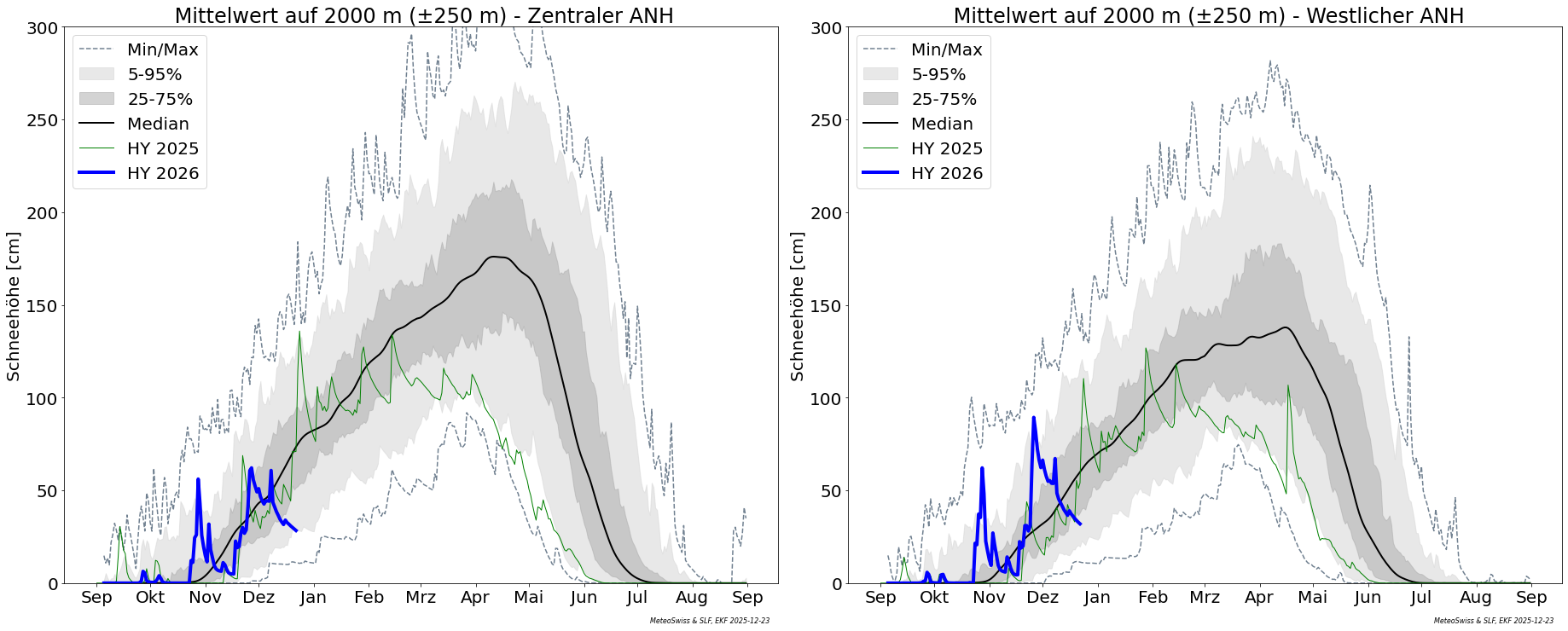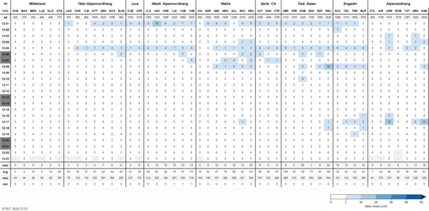 Malgré la présence de couches fragiles à de nombreux endroits, le danger d'avalanche était faible (niveau 1) ou modéré (niveau 2) peu avant Noël 2025. La constitution du manteau neigeux était défavorable, surtout en altitude, en vue des chutes de neige à venir. Au moment de la publication du blog, aucune grosse chute de neige n'était encore en vue.