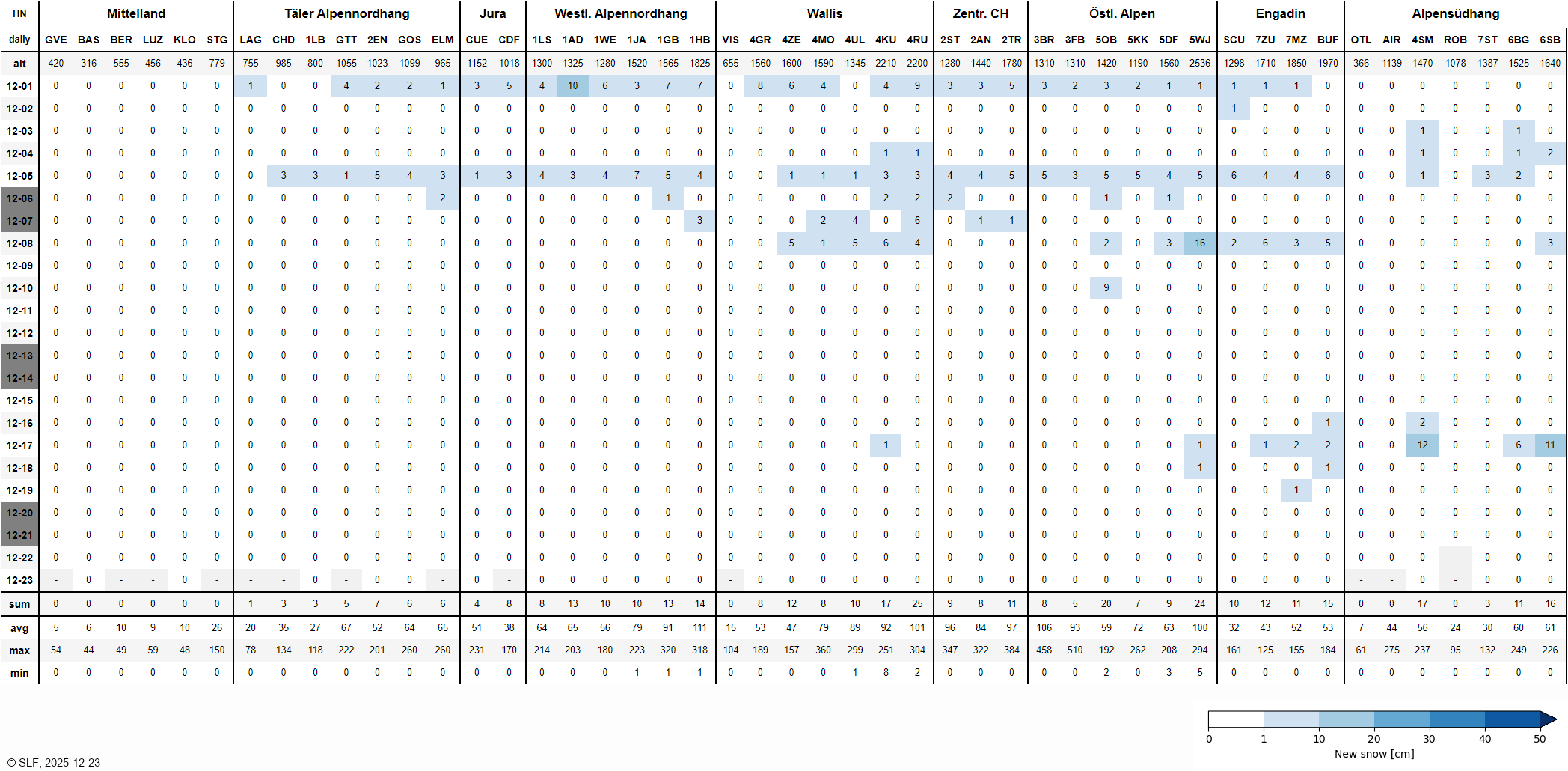 Depuis le dernier Avablog, aucune neige fraîche n'est tombée dans le nord. Entre le 17 et le 23 décembre, 10 à 20 cm de neige sont tombés sur une grande partie de la crête principale des Alpes et au sud de celle-ci, et jusqu'à 40 cm dans l'ouest du Tessin et dans la région du Simplon. Cette neige fraîche dans le sud a recouvert en altitude une couche mince mais fragile de neige ancienne composée de grains anguleux.