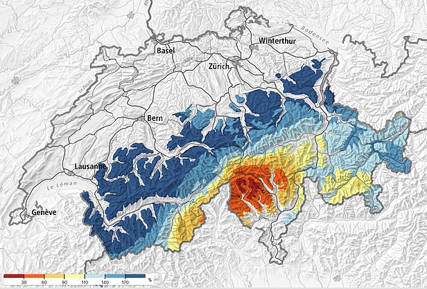 Dans l'ouest, les quantités de neige fraîche étaient énormes : dans l'extrême ouest du Bas-Valais et sur l'ouest du versant nord des Alpes adjacent, on a enregistré de 100 à 150 cm de neige (figure 3). Mais sur le reste du versant nord des Alpes, on a également enregistré 50 à 80 cm de neige fraîche sur une grande partie du territoire. Même le Jura a reçu un manteau hivernal précoce, avec 40 à 60 cm de neige sur les plus hauts sommets. C'est dans le sud que l'apport de neige a été le plus faible.