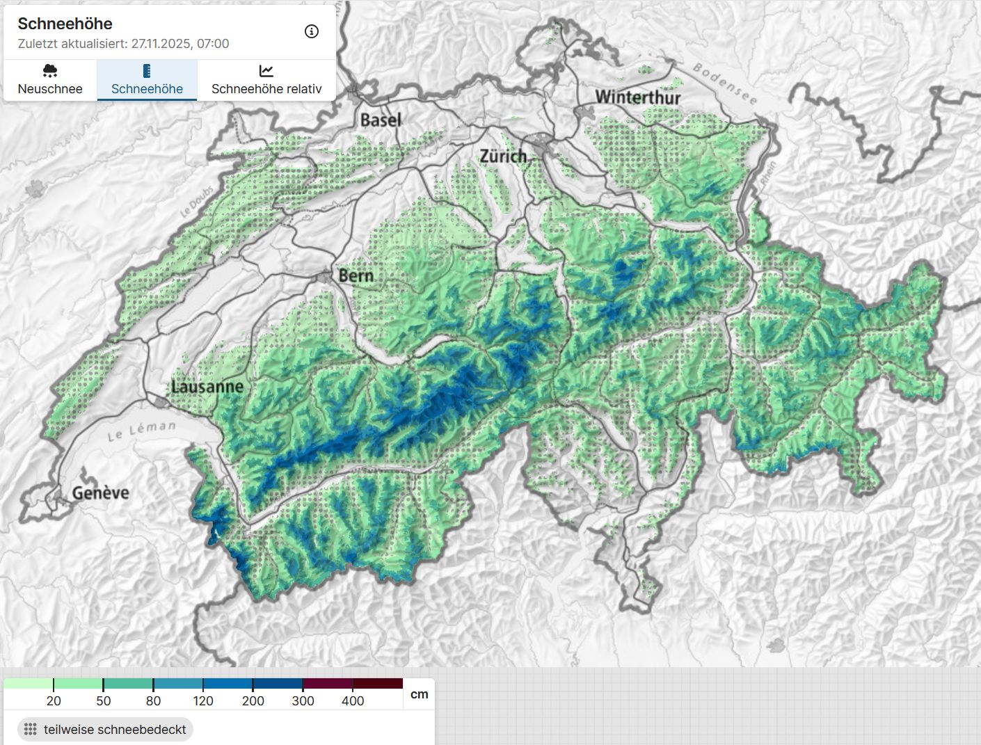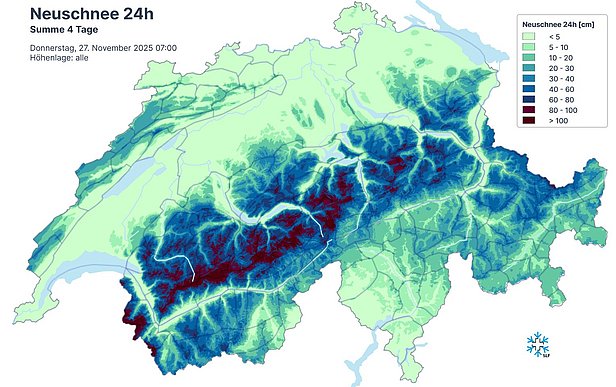 Dans l'ouest et le nord, la neige est tombée en abondance, même à moyenne altitude. Les hauteurs de neige étaient nettement supérieures aux moyennes de fin novembre. Dans l'ouest, l'enneigement était exceptionnellement important. Le danger d'avalanche a nettement augmenté sur une grande partie du territoire. Dans l'ouest, un fort danger d'avalanche (degré 4) a été prognostiqué pour plusieurs jours.