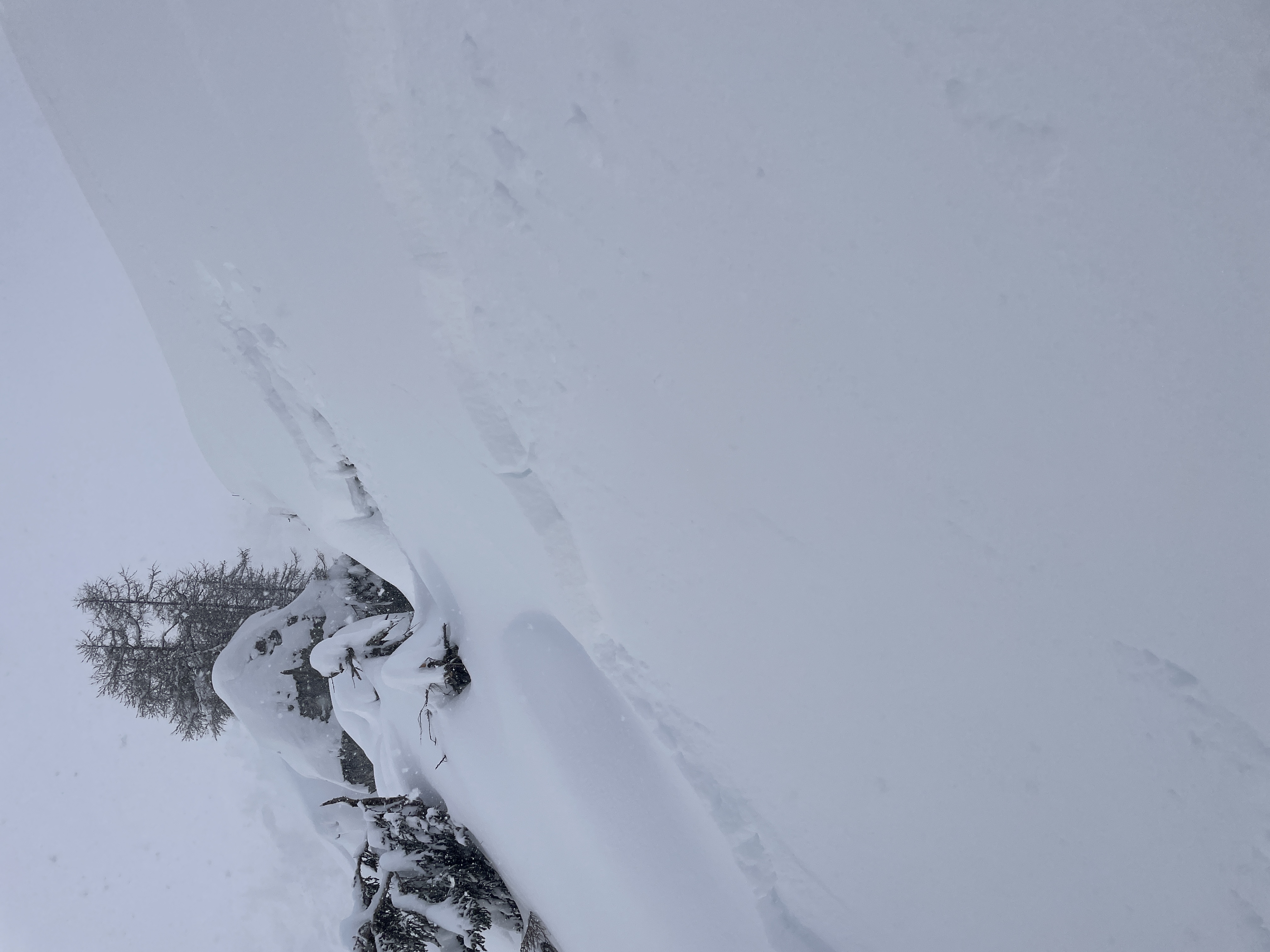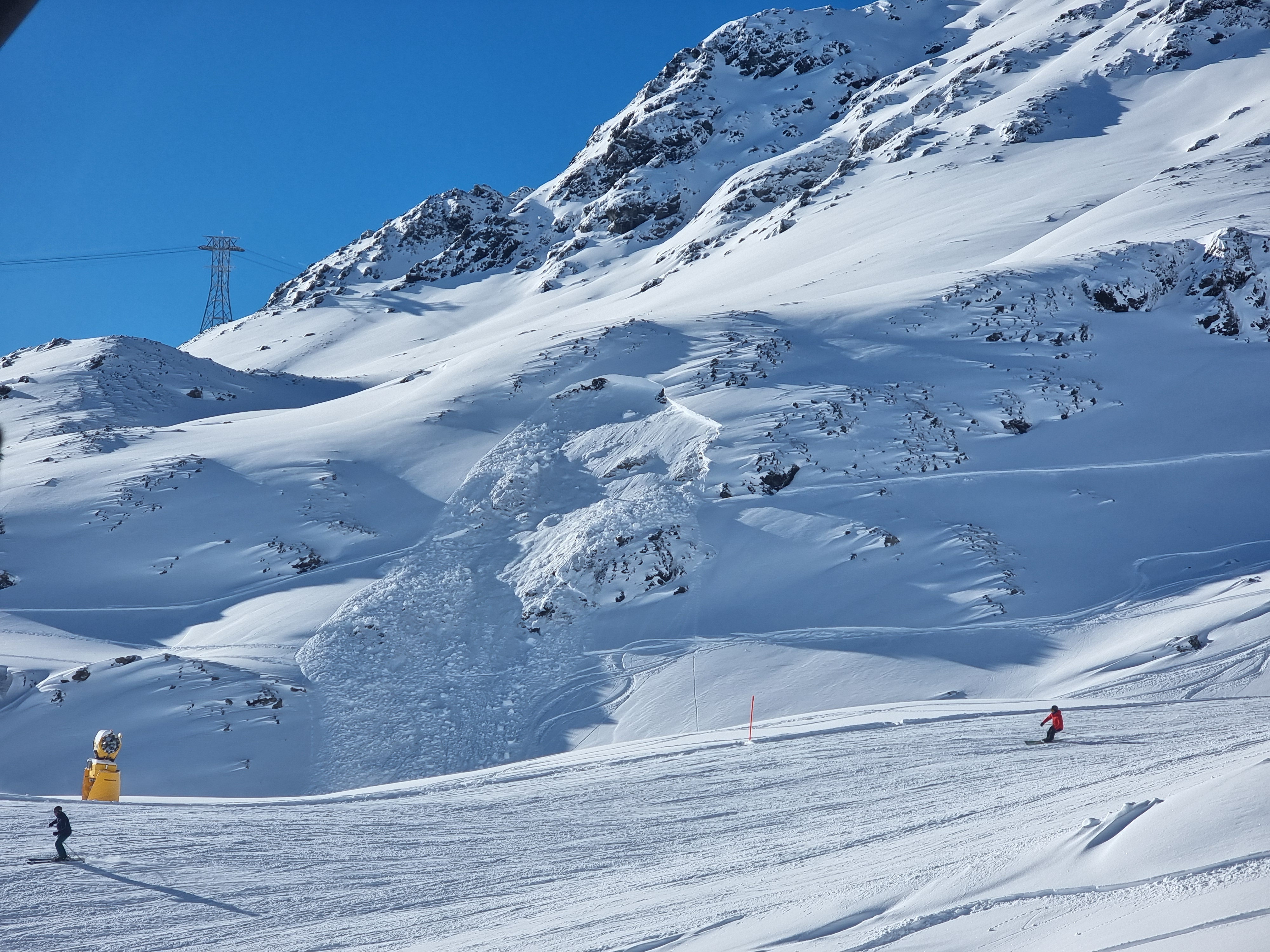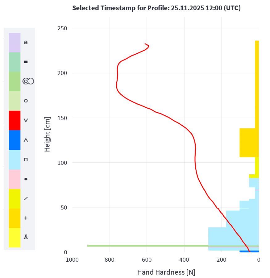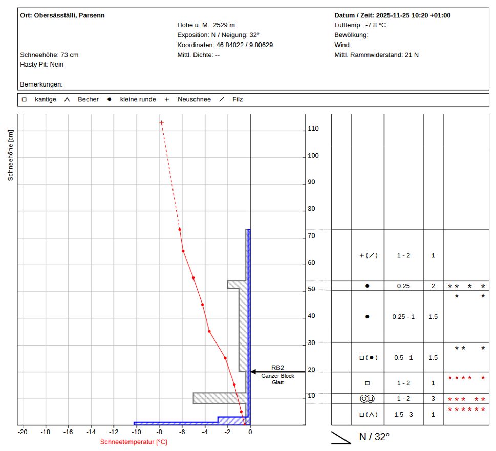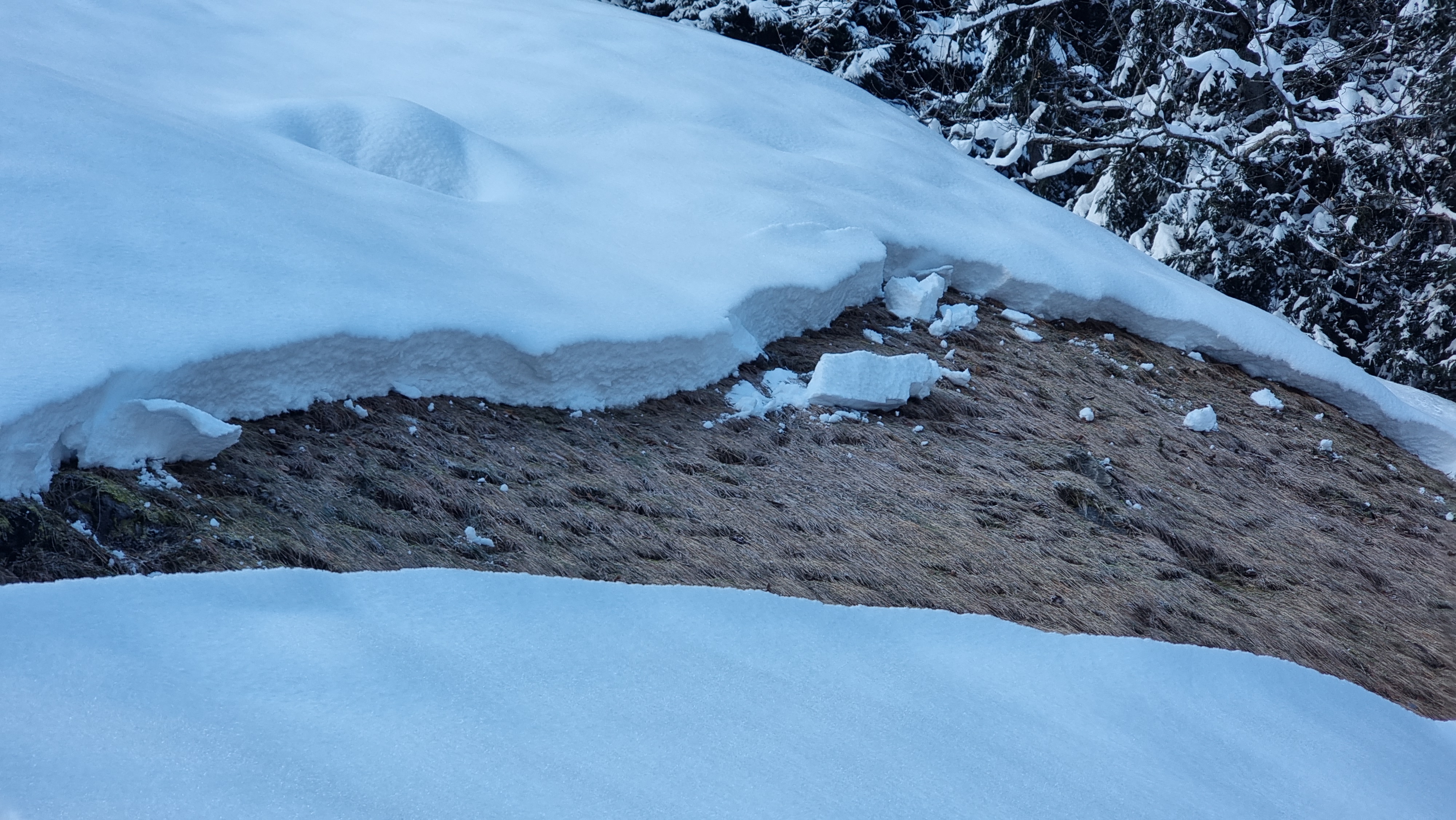 La surface neigeuse était recouverte de neige fraîche froide et meuble tombée du 19 au 22 novembre. De plus, la surface a subi une métamorphose constructive au cours de la nuit du 23 novembre et du givre de surface s'est également formé dans certaines régions. Cette évolution a donné lieu à un substrat défavorable pour la neige fraîche tombée et la neige soufflée transportée le lundi 24 novembre par des températures douces. La neige fraîche et la neige soufflée ont rapidement formé une plaque de neige. Il fallait s'attendre à ce que cette plaque de neige puisse se décrocher facilement sous forme d'avalanche sur le substrat meuble (cf. photo 4).