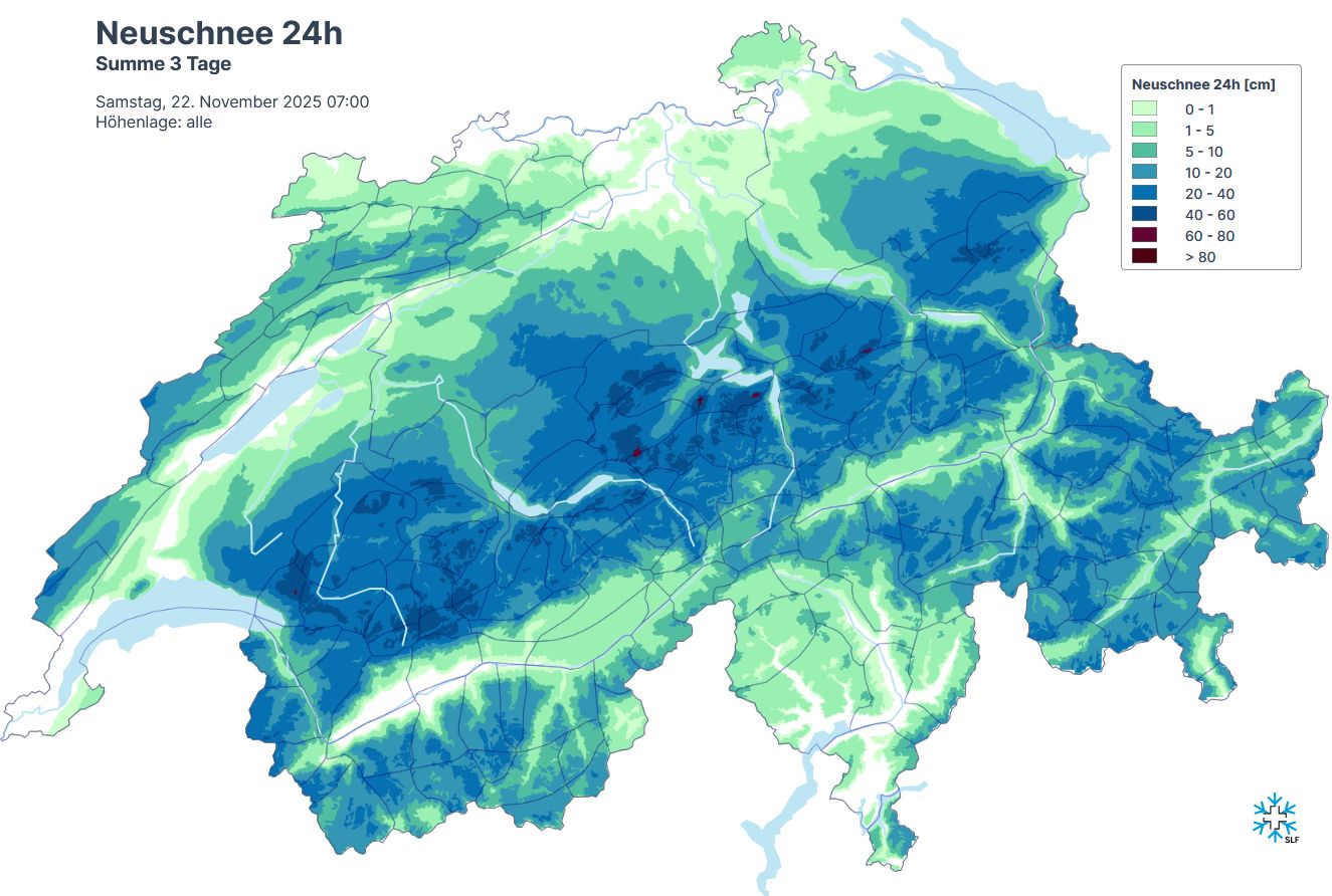 À partir du mercredi 19 novembre, de nouvelles chutes de neige se sont produites alors que les températures continuaient de baisser (cf. blog du 18.11.25). Elles ont persisté jusqu'au samedi 22 novembre. La limite des chutes de neige est descendue en dessous de 500 m. L'apport de neige était de 20 à 40 cm sur une grande partie du versant nord des Alpes, de 10 à 20 cm dans le sud du Valais et dans les Grisons, et jusqu'à 40 cm en altitude. Dans le Jura et sur le centre du versant sud des Alpes, il a neigé quelques centimètres (cf. figure 1). Avec environ -10 °C à 2000 m, il faisait froid et la neige était meuble. Jusqu'au jeudi matin, le vent était encore modéré à fort de secteur sud-ouest, puis il s'est orienté au nord-est et était toujours modéré à fort. La neige fraîche meuble a alors été en partie intensivement transportée par le vent. Comme l'ont confirmé certaines informations sur les avalanches, surtout sur le versant nord des Alpes, les accumulations de neige soufflée pouvaient se décrocher facilement en cas de danger marqué d'avalanche (degré 3).
