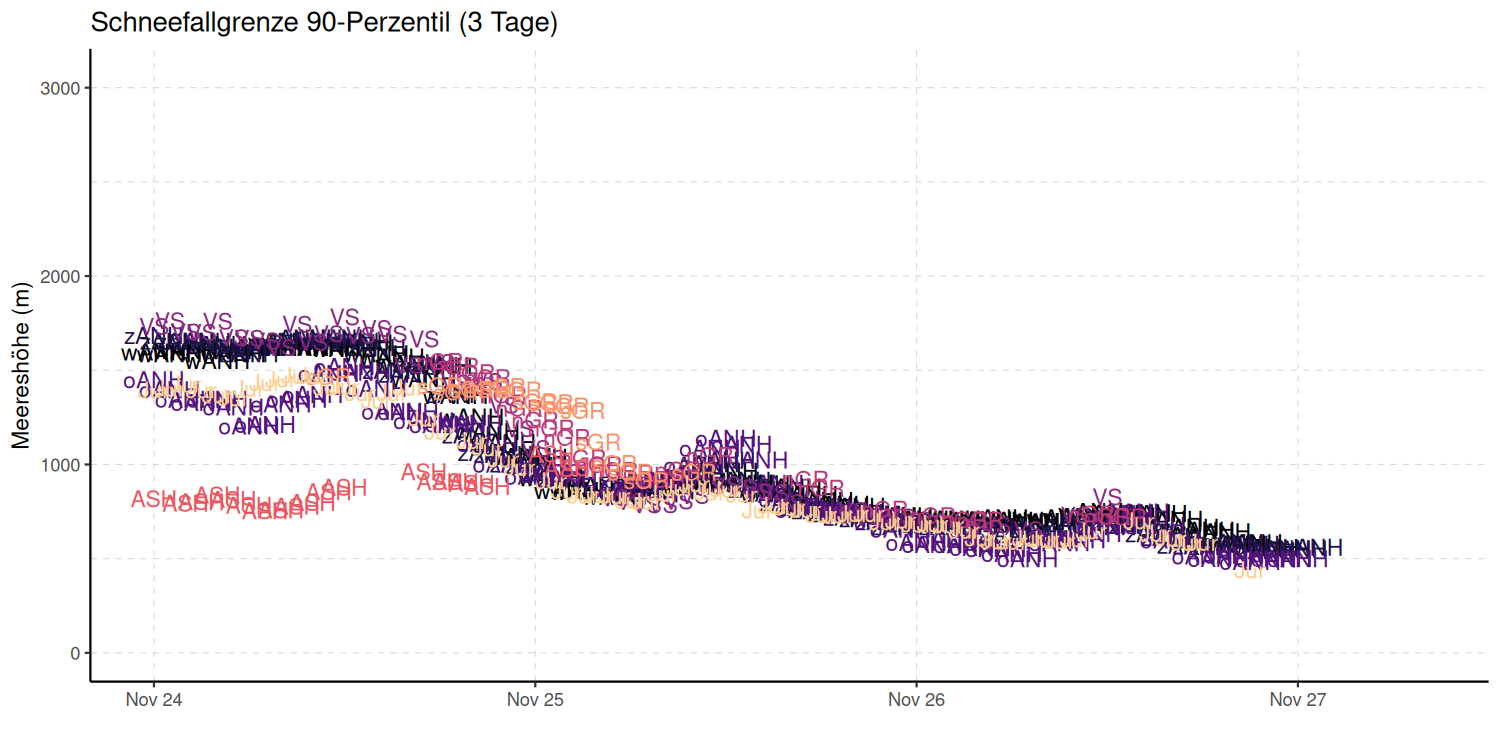 Après une journée ensoleillée et froide en montagne le samedi 22 novembre, des nuages ont envahi le ciel à partir de l'ouest le dimanche 23 novembre. De dimanche soir 23 novembre jusque dans la nuit du mercredi au jeudi 27, des précipitations sont tombées de manière persistante dans l'ouest et le nord, et de manière intensive dans l'extrême ouest. Le lundi 24 novembre, la limite des chutes de neige se situait à 1800 m dans l'ouest, 1400 m dans l'est et 800 m dans le sud. Par la suite, elle est descendue à environ 800 m dans toutes les régions (figure 2).